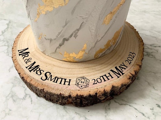 Personalised Log Wedding Cake Stand with 1d20 DnD dice