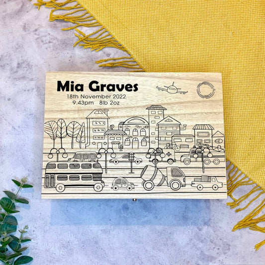Caja de recuerdo de bebé de madera grabada personalizada grande con estrellas