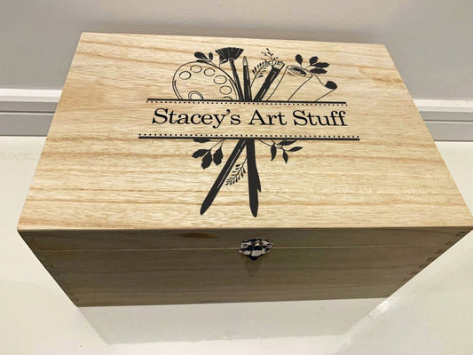 Caja de arte de madera grabada personalizada grande con diseño de pincel y paleta