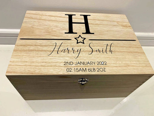 Caja de recuerdo de inicial de bebé de madera grabada personalizada grande con estrellas