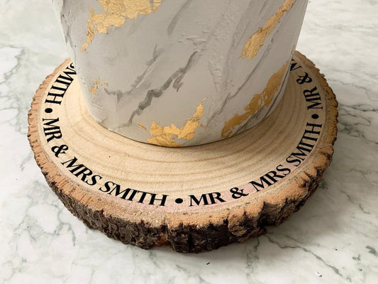 Rebanada de madera grabada personalizada, tablero de exhibición de pastel de boda, tablero de pastel envolvente Mr y Mrs