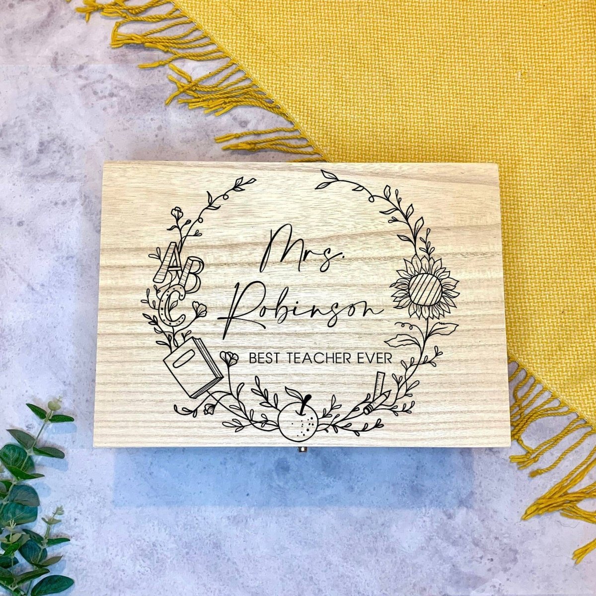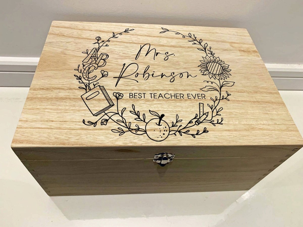 Nuestra caja de regalo de madera grabada es perfecta para celebrar al maestro que siempre está ahí cuando lo necesitas. El tamaño perfecto para guardar todo tipo de cosas y con la frase "El mejor maestro del mundo", que brinda una forma única y reflexiva de mostrar agradecimiento.