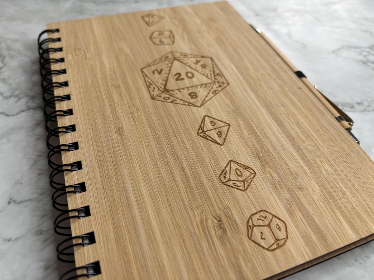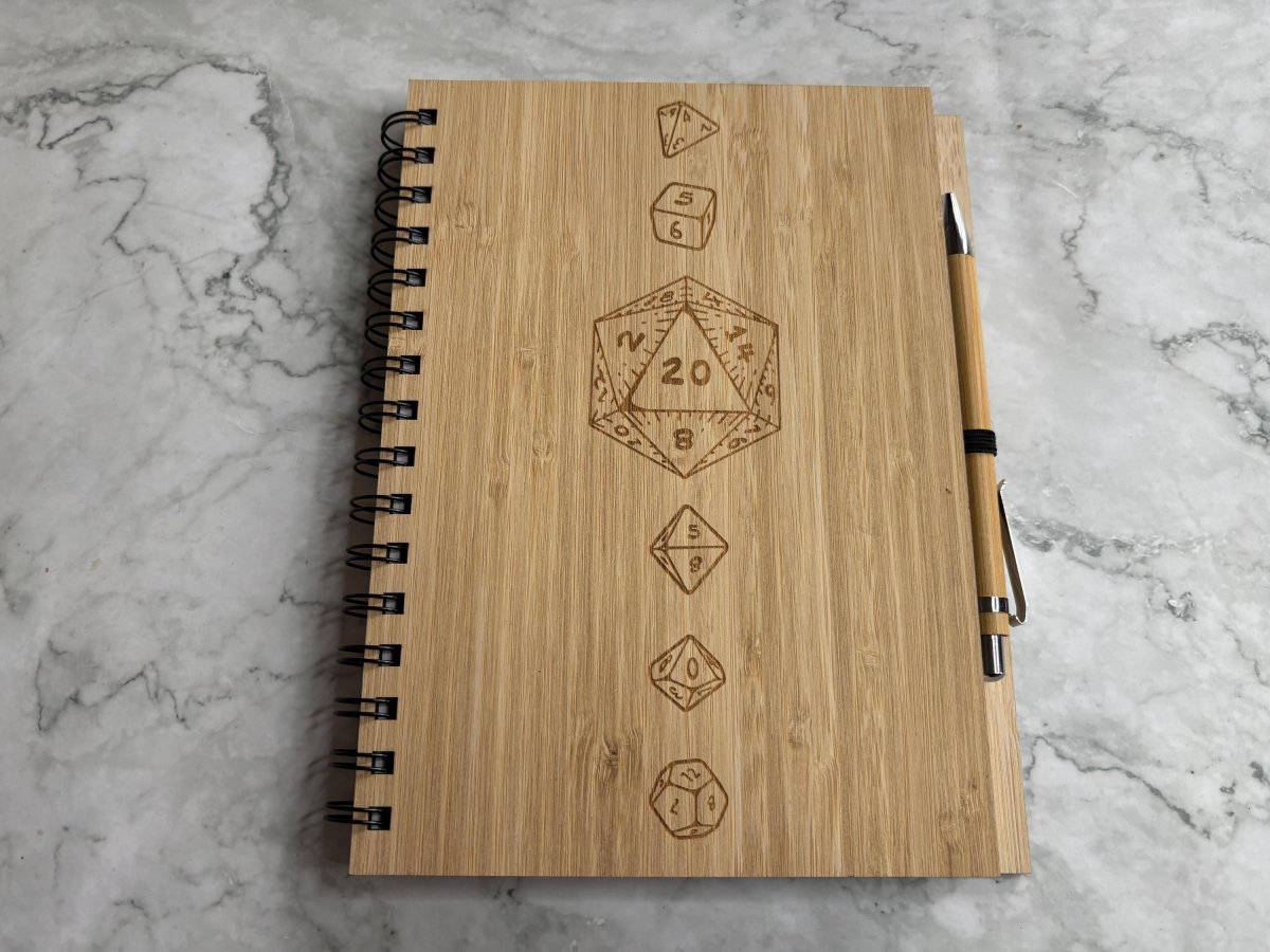 Engraved Bamboo DnD Dice set D20 Campaign Notebook, Adventurer's Notes, Critical Hit, D20,