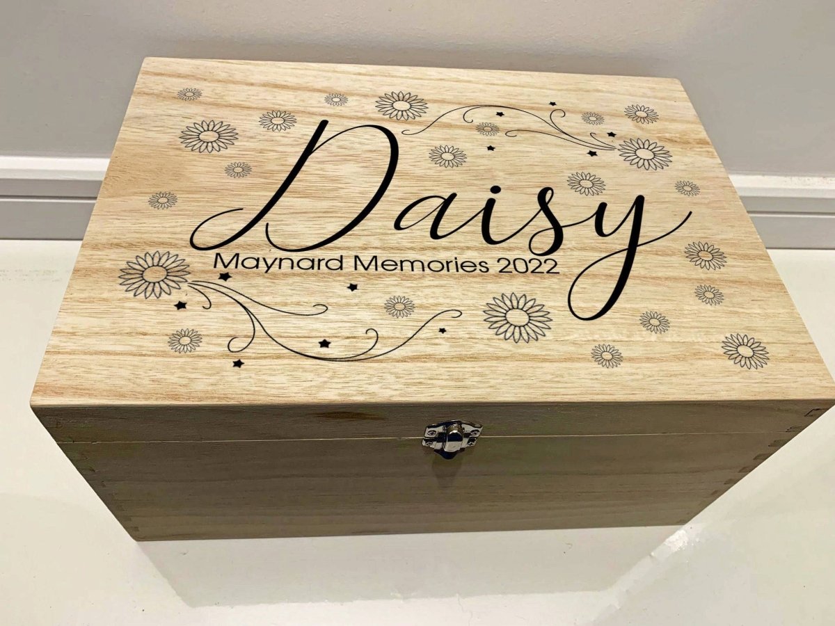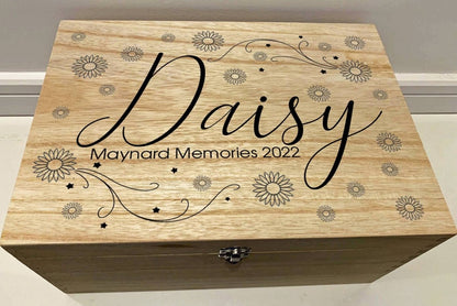 Caja de memoria de recuerdo de bebé de madera grabada personalizada grande con margaritas y estrellas