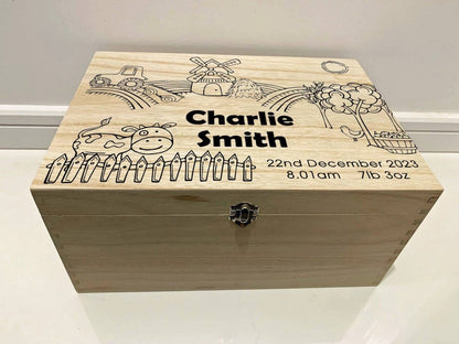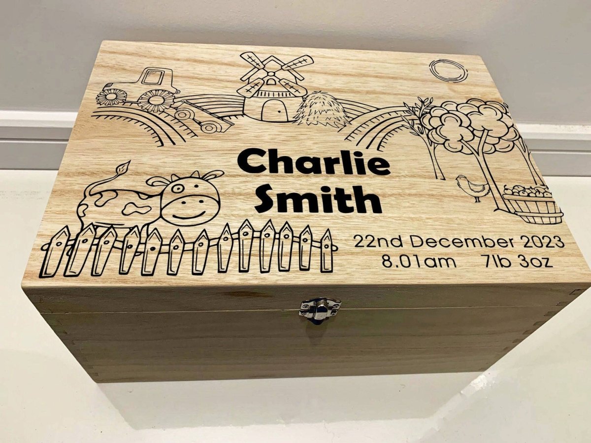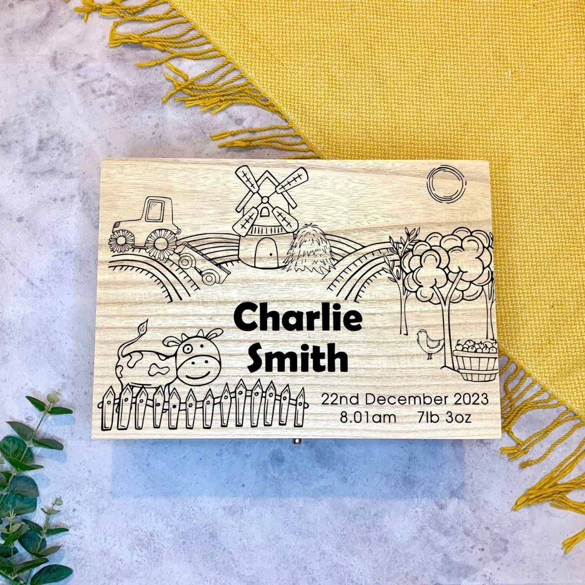 Caja de memoria de recuerdo de granja para bebés de madera grabada personalizada grande con molino de viento y tractor, vaca y pollo