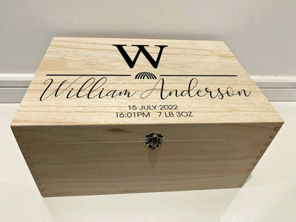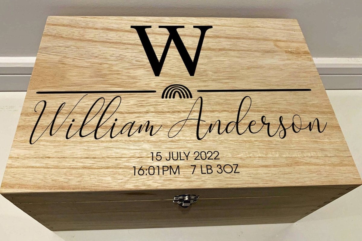Caja grande de recuerdo con inicial de bebé de madera grabada personalizada con arcoíris