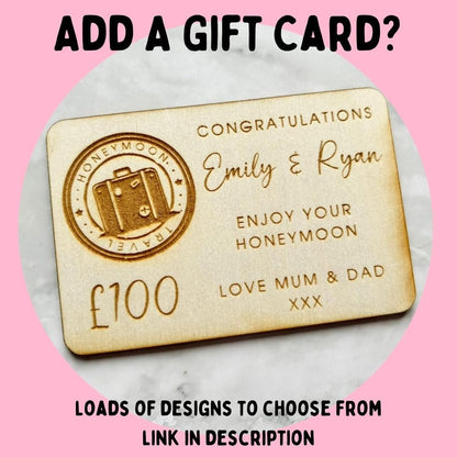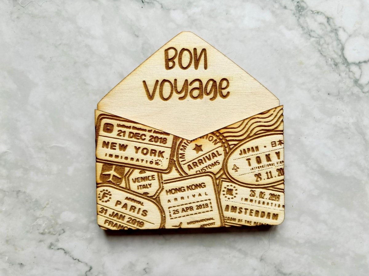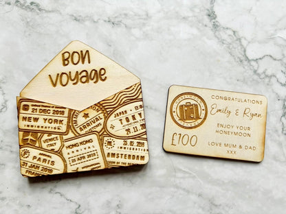 This personalised wooden travel envelope gift card holder is the perfect way to present travel or honeymoon gift vouchers. Engraved with "bon voyage", or a personalised message, it adds a personalised touch to your thoughtful gift. A unique and elegant choice for any traveller or honeymooner.