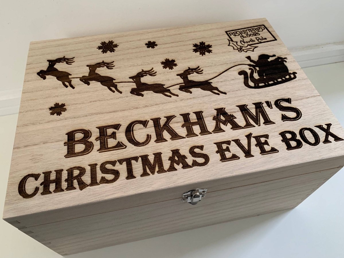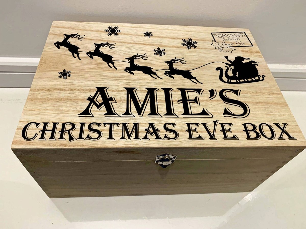 Caja grande personalizada de Nochebuena de madera grabada con trineo de Papá Noel y renos