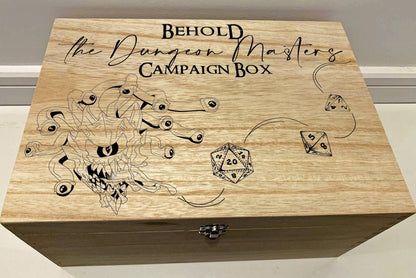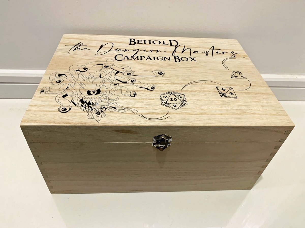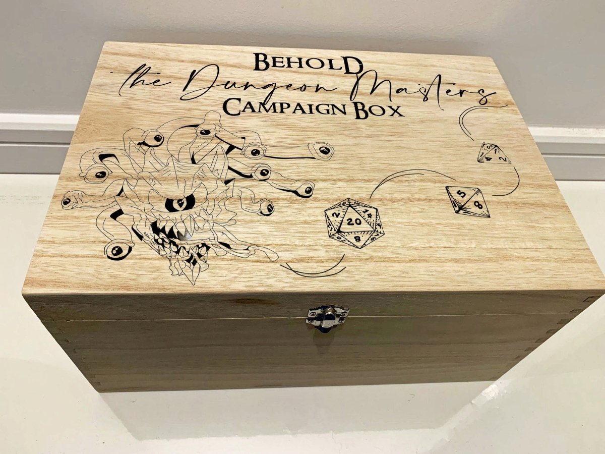Esta caja grabada con láser profesionalmente es la manera perfecta de almacenar todos tus dados de mazmorras y dragones o notas de campaña.