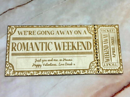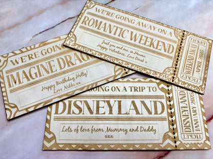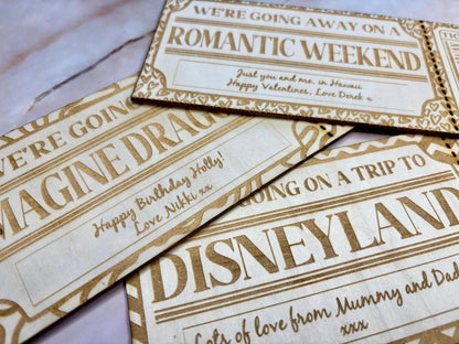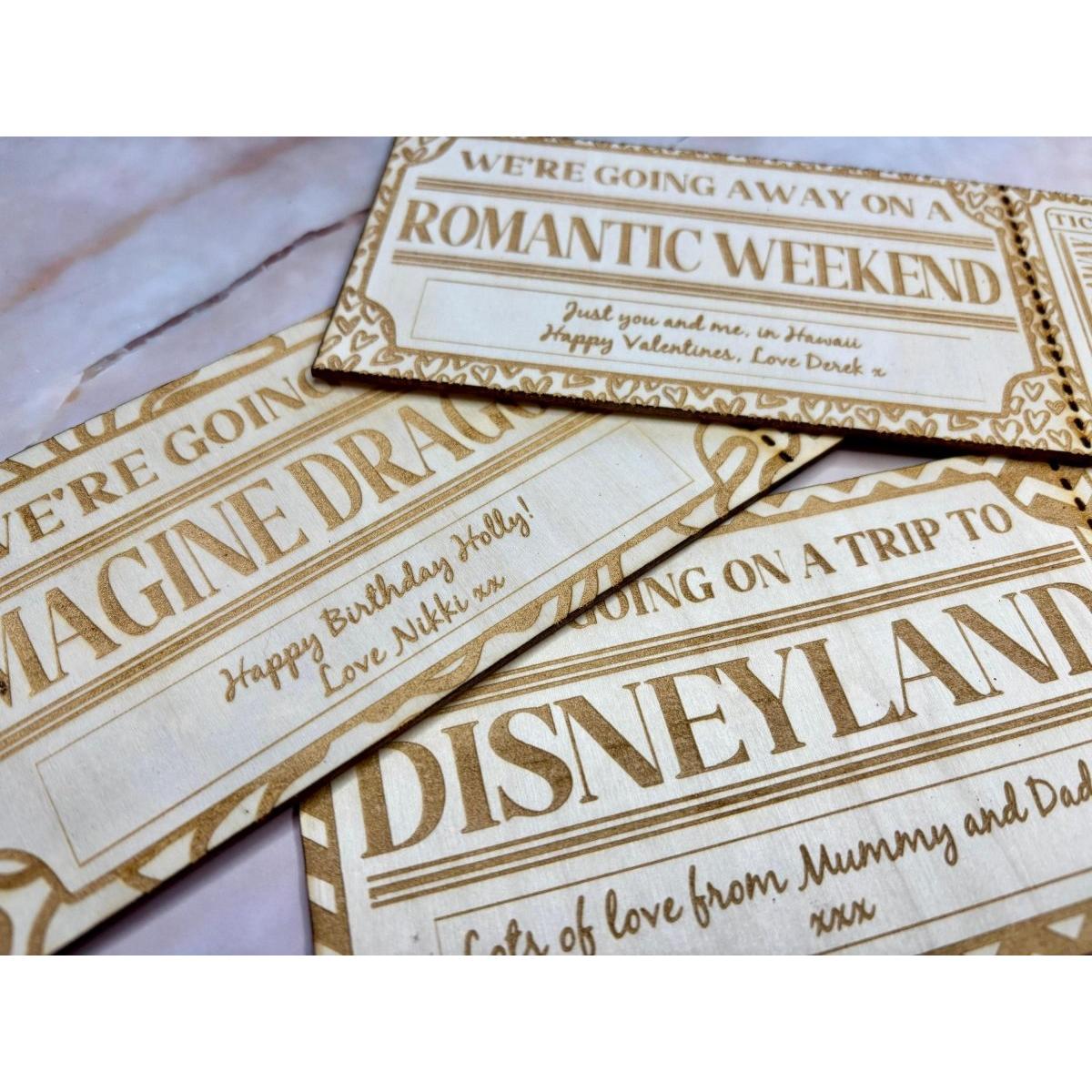 Enhance your gifting game with our personalised engraved wooden tickets for events, birthdays, weddings, and Valentine's Day. Give the gift of a memorable experience with our expertly crafted and unique tickets that will be cherished for years to come. Personalised with details of the event and a personalised message, this is the perfect gift for all types of ticket.