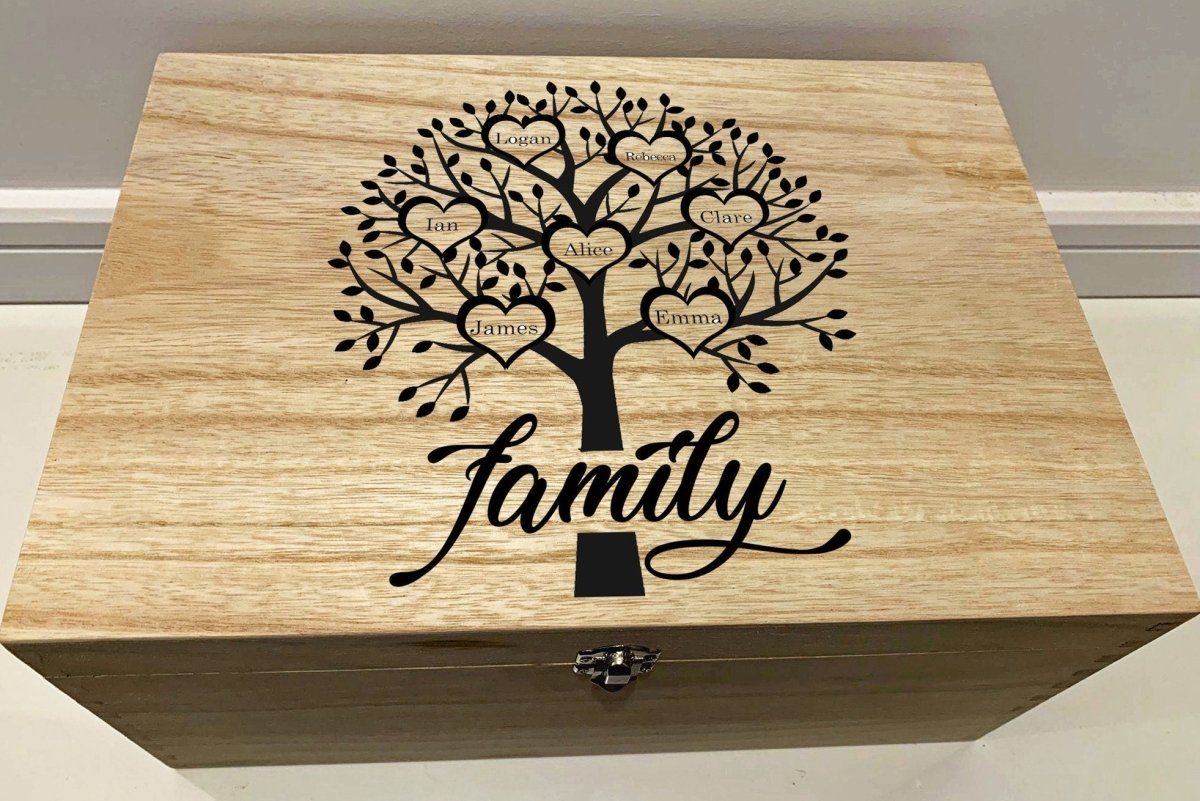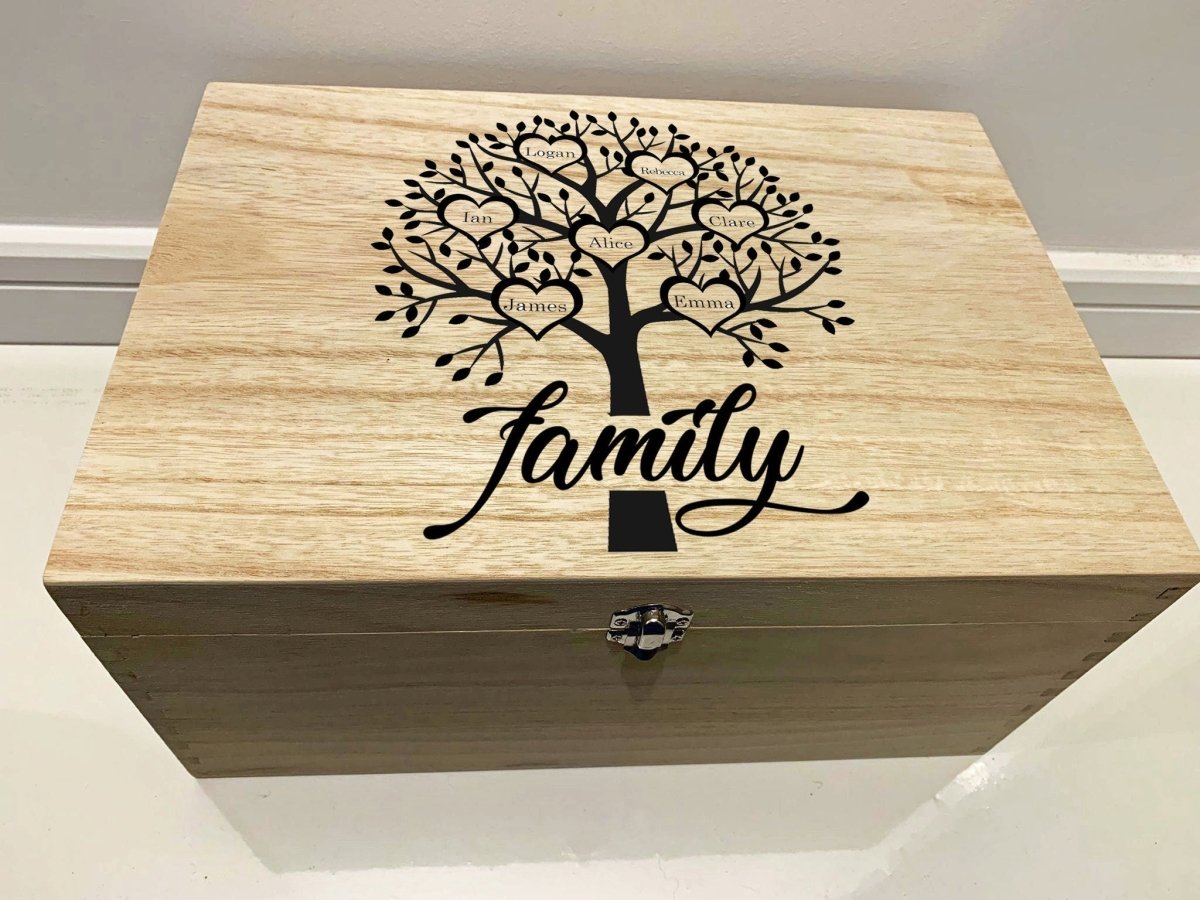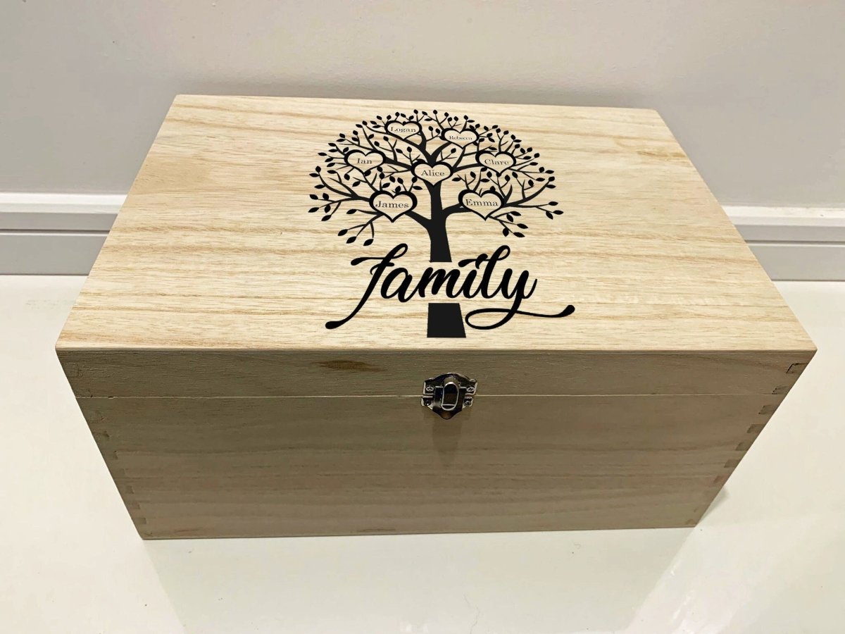 Caja de recuerdos de árbol genealógico de madera grabada personalizada grande