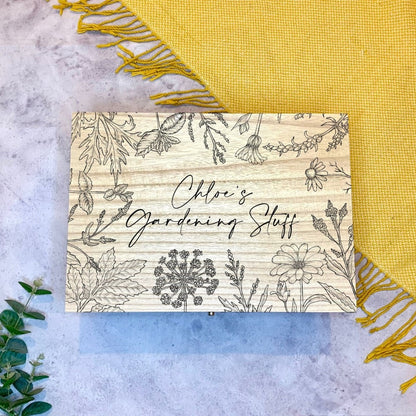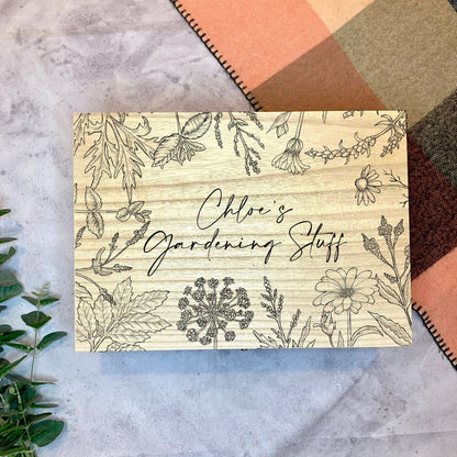 Caja de jardinería grande de madera grabada personalizada con flores y hierbas