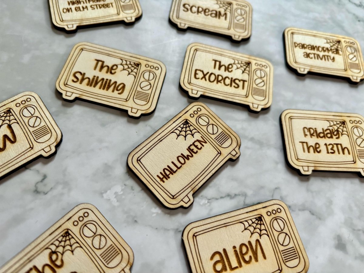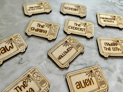 Personalised Engraved Wooden Halloween Movie Tokens, Halloween countdown advent, Engraved tokens, Spooky movies, Horror movie tokens, set of 10