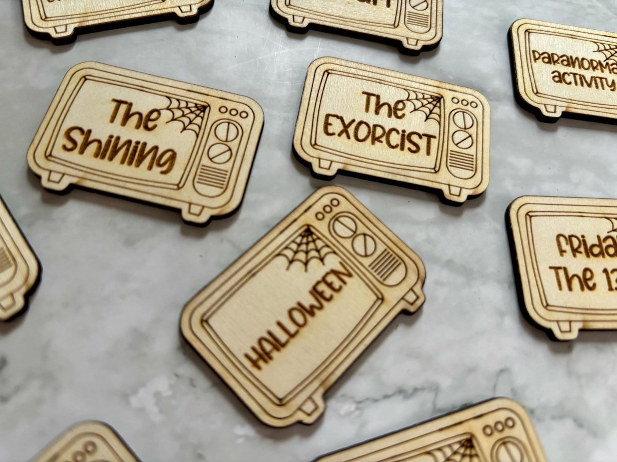 Enhance your Halloween movie marathon with our set of 10 engraved wooden tokens. Each token features a spooky movie, perfect for your Halloween countdown. Bring a touch of horror and scares to your movie night with these personalised tokens.