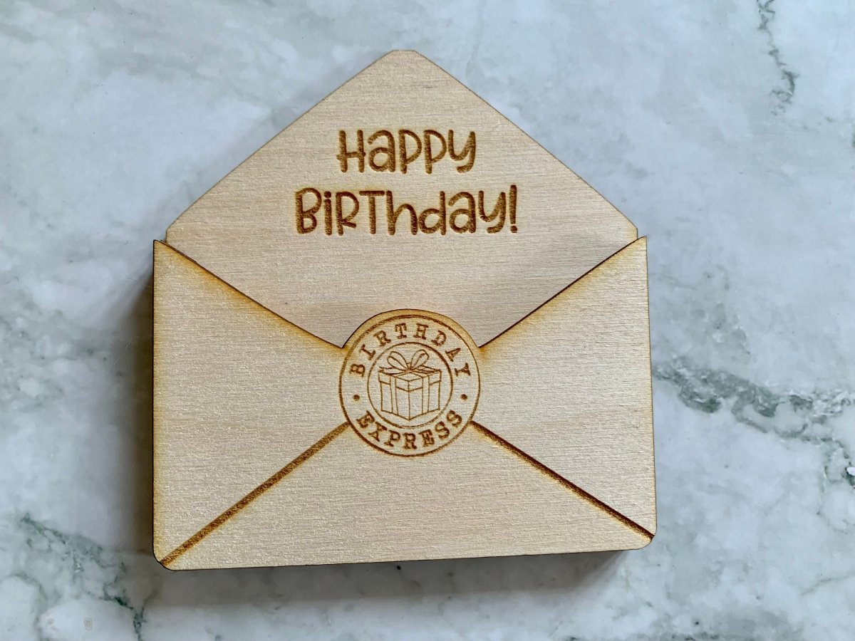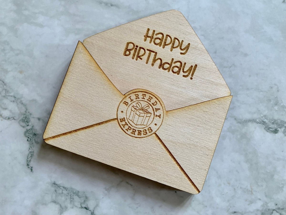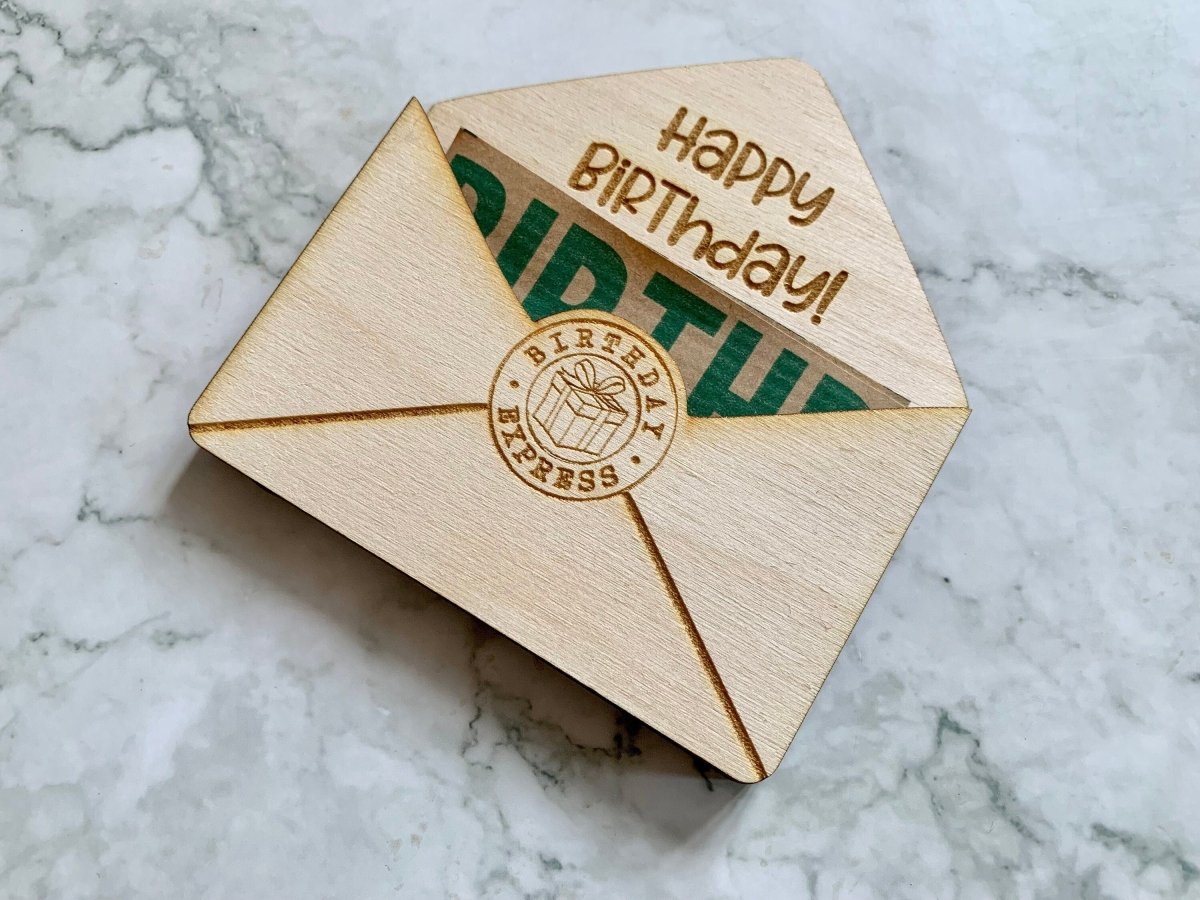Sorprenda a su ser querido con un tarjetero de regalo grabado personalizado con un sobre especial "Feliz cumpleaños". Una forma atemporal de hacerlos sentir muy especiales, este soporte es una forma única de darles el regalo perfecto.