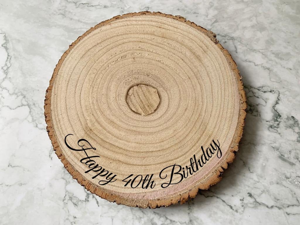 Esta rebanada de madera grabada con láser profesionalmente es la manera perfecta de exhibir su pastel de cumpleaños rústico.