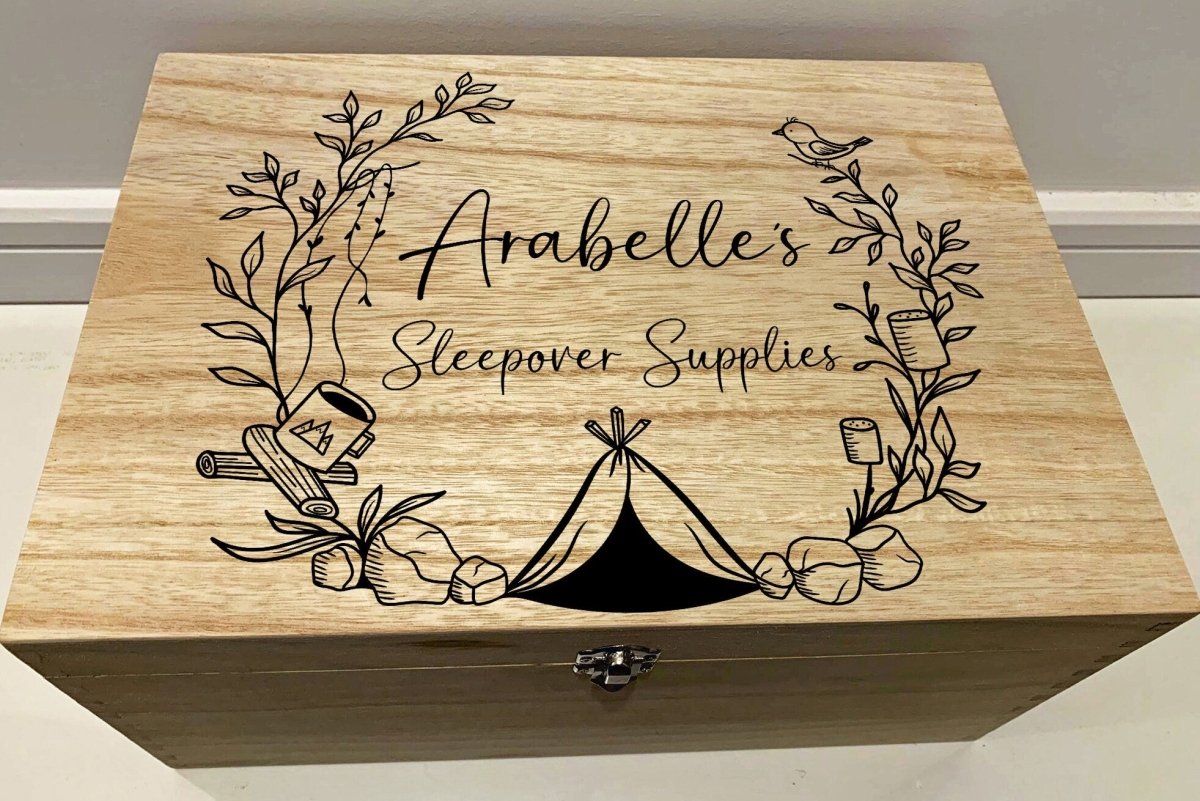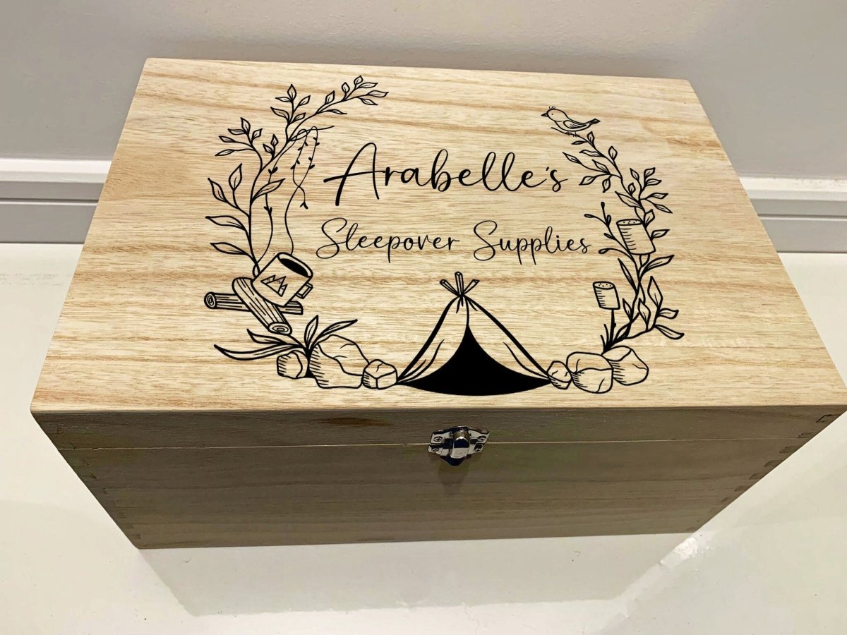 Esta caja de recuerdo de fiesta de pijamas personalizada y grabada es un excelente regalo para conservar momentos especiales. Elaborada con madera de alta calidad, la tapa presenta un grabado único de su elección, lo que la convierte en un regalo especialmente personalizado. Perfecto para cumpleaños o cualquier otra ocasión especial.