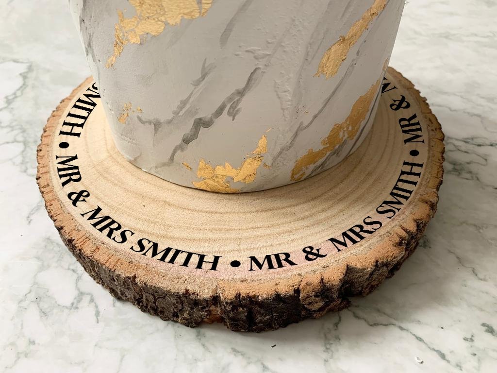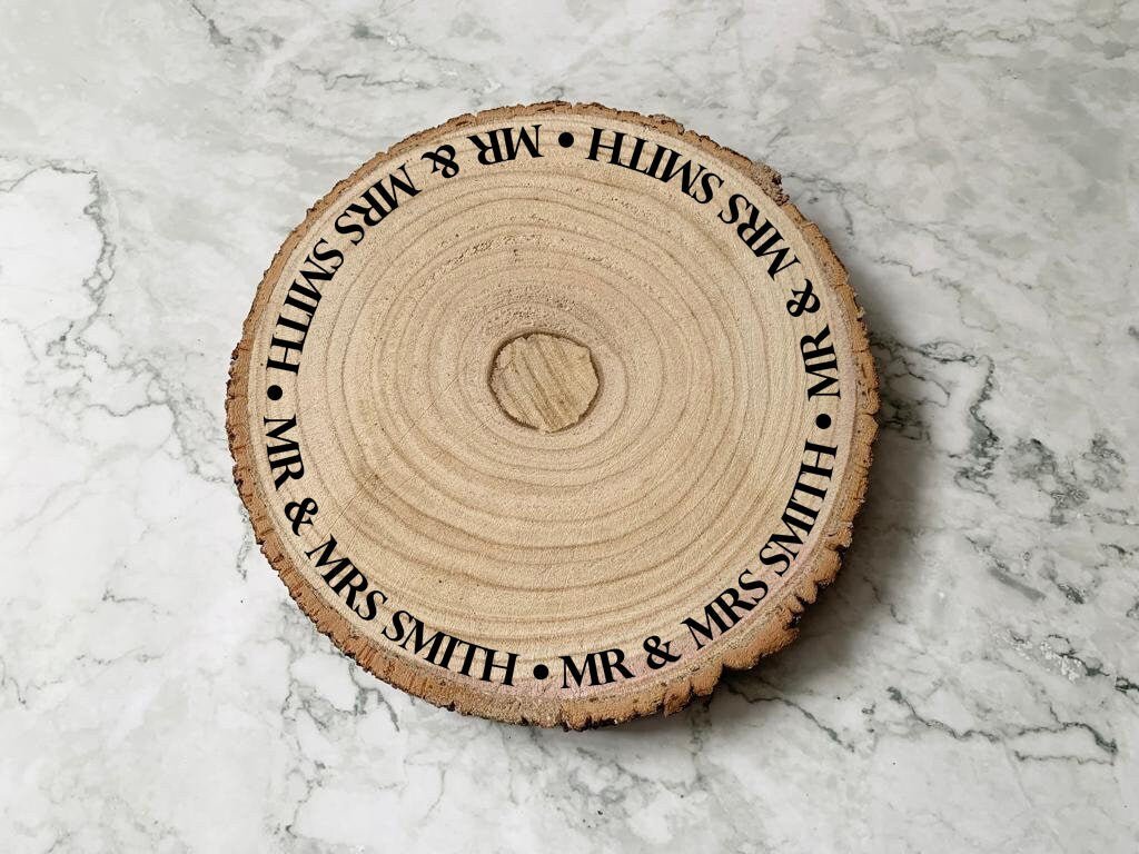 Esta tabla para pasteles de madera maciza es la manera perfecta de exhibir un pastel de bodas de una manera única. Perfectamente grabado con un marco que dice "Mr and Mrs", este tablero de exhibición de pasteles personalizado seguramente será un tema de conversación. Con una veta de madera natural, nuestra tabla para pasteles en rodajas de madera es el acompañamiento perfecto para su día especial.