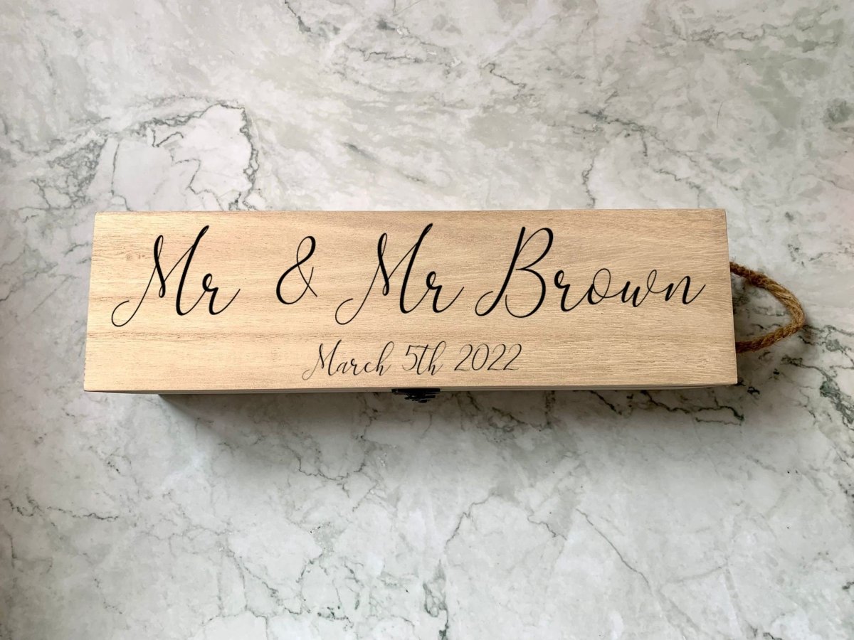 Caja de regalo personalizada para botella de vino de madera grabada Mr & Mrs