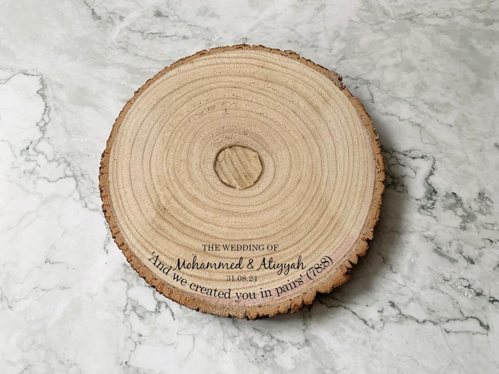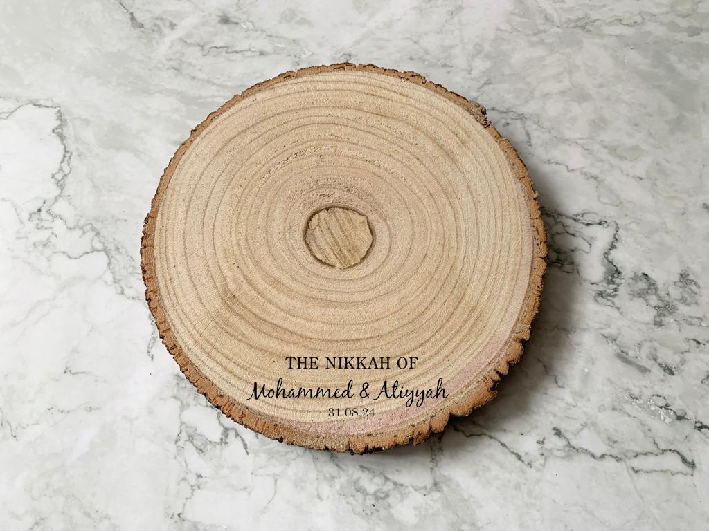 Personalised Engraved Wood Slice, Nikkah Wedding Engagement Ring Plate, Rustic Wooden Log Slice for Nikah Ceremony Celebration