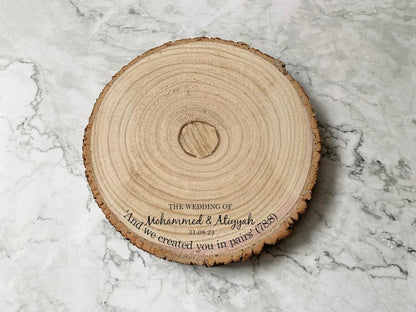 Enhance your Nikah ceremony with our personalised engraved rustic wood slice ring plate. This unique plate adds a charming touch to your special day. Each slice is customisable and makes for a perfect keepsake. Complete your celebration with this elegant and timeless addition.