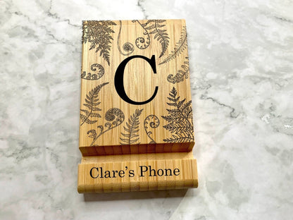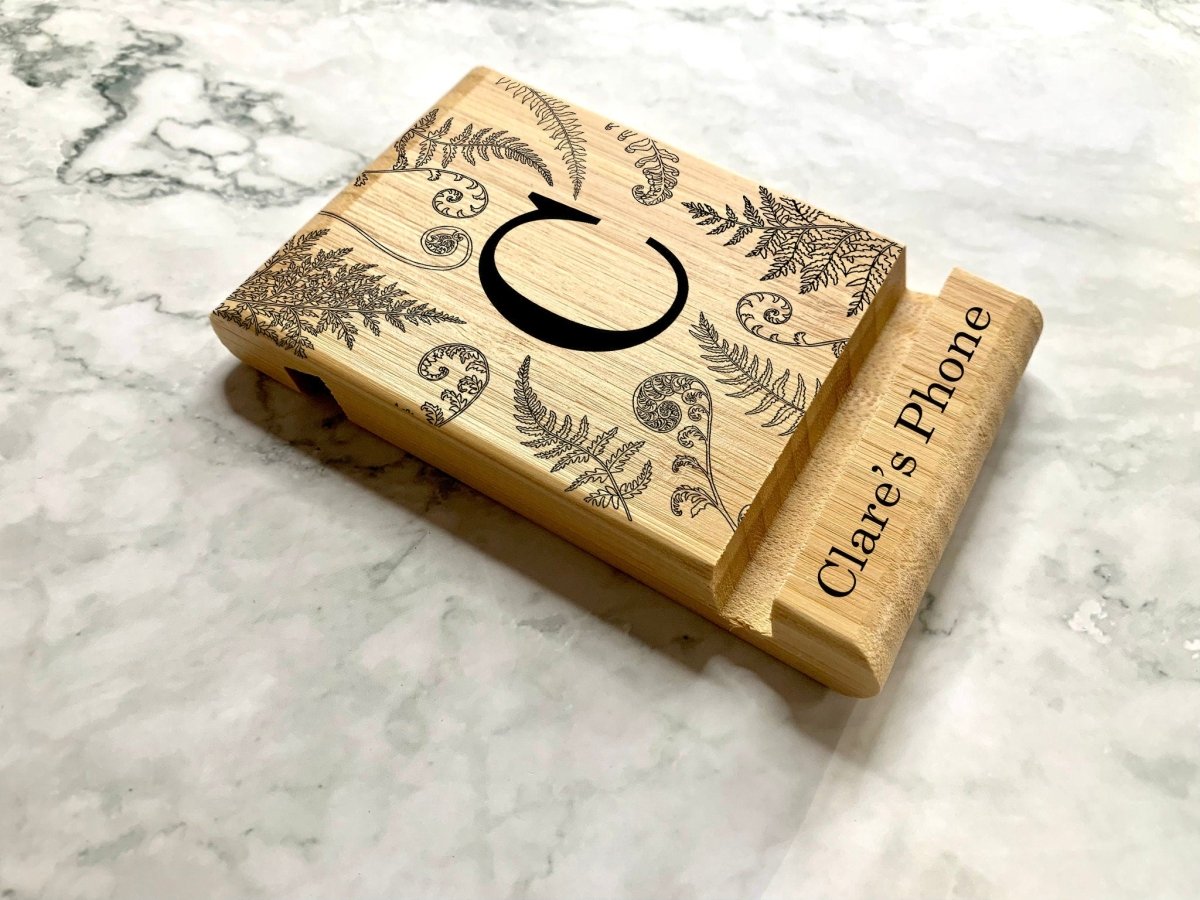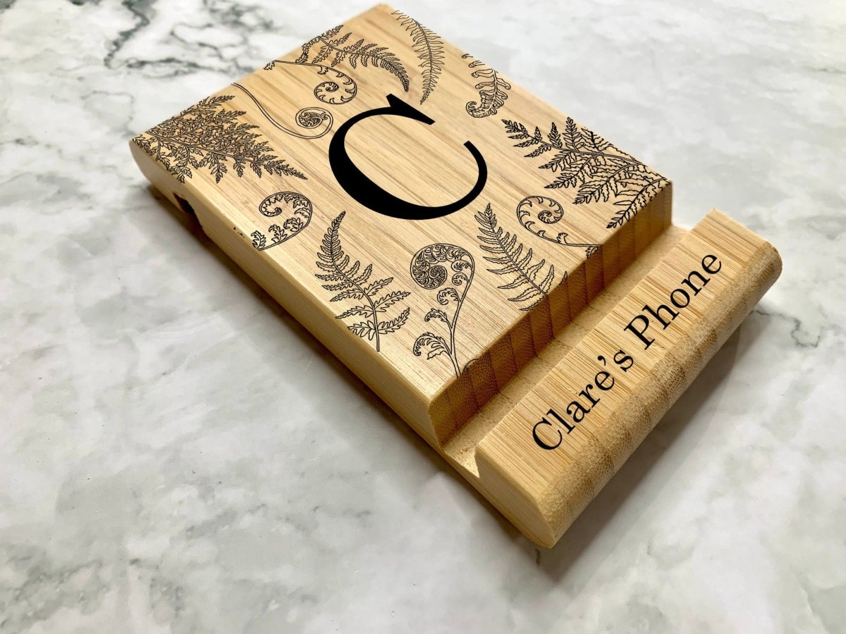 Soporte para teléfono de madera de bambú grabado personalizado, soporte para iPad, soporte para tableta, soporte para iPad, soporte para tableta, soporte para teléfono con helechos