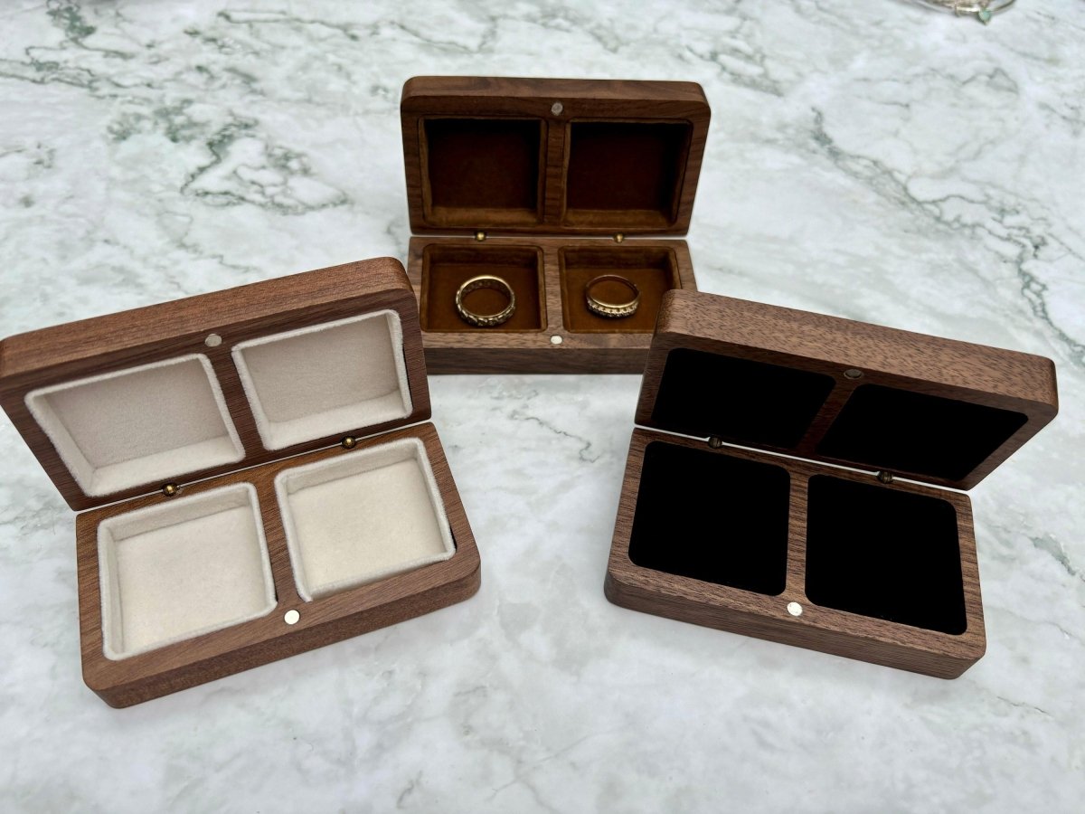 All ring boxes are made from Walnut, and have a choice of velvet inserts.