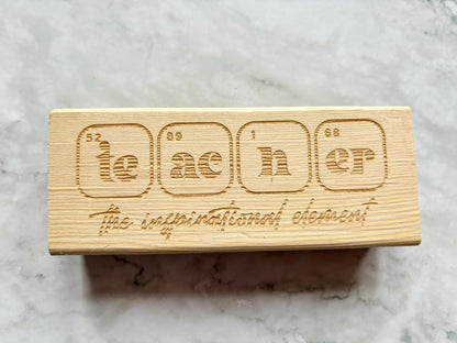 This beautiful wooden decoration, professionally laser etched, can have either the "Teacher, an Inspirational Element" design or can be personalised with your choice of name.