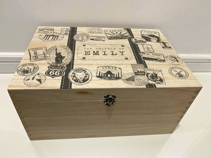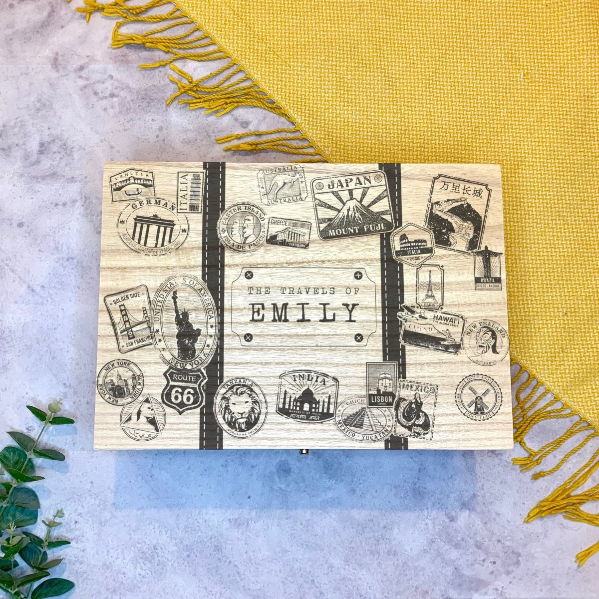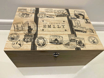 This travel memory box is perfect for storing your travel memories. Designed to look like a suitcase covered in travel stamps, it's a unique and stylish way to keep your cherished keepsakes safe. Ideal for travellers or as a special gift for someone who loves to explore.
