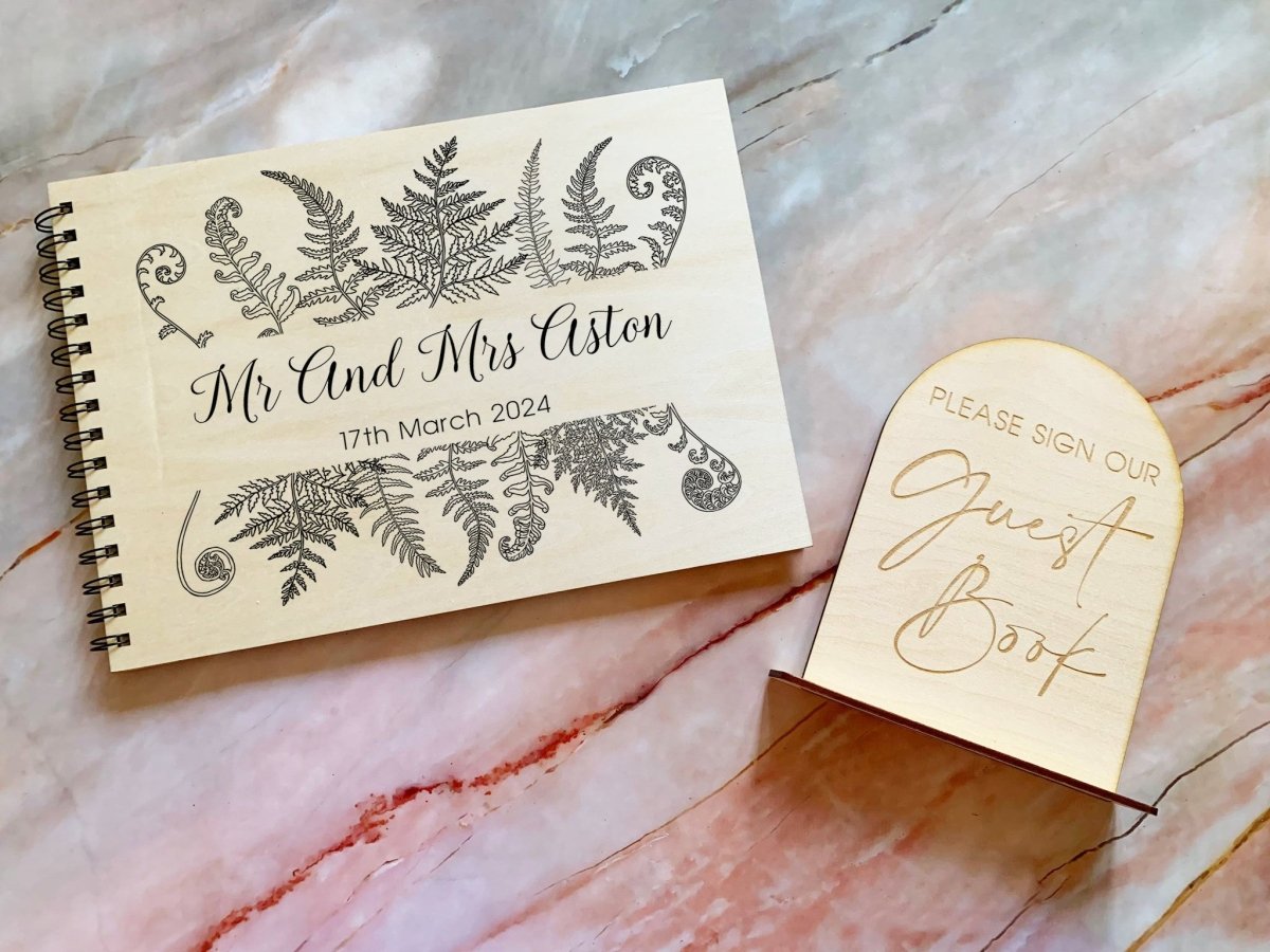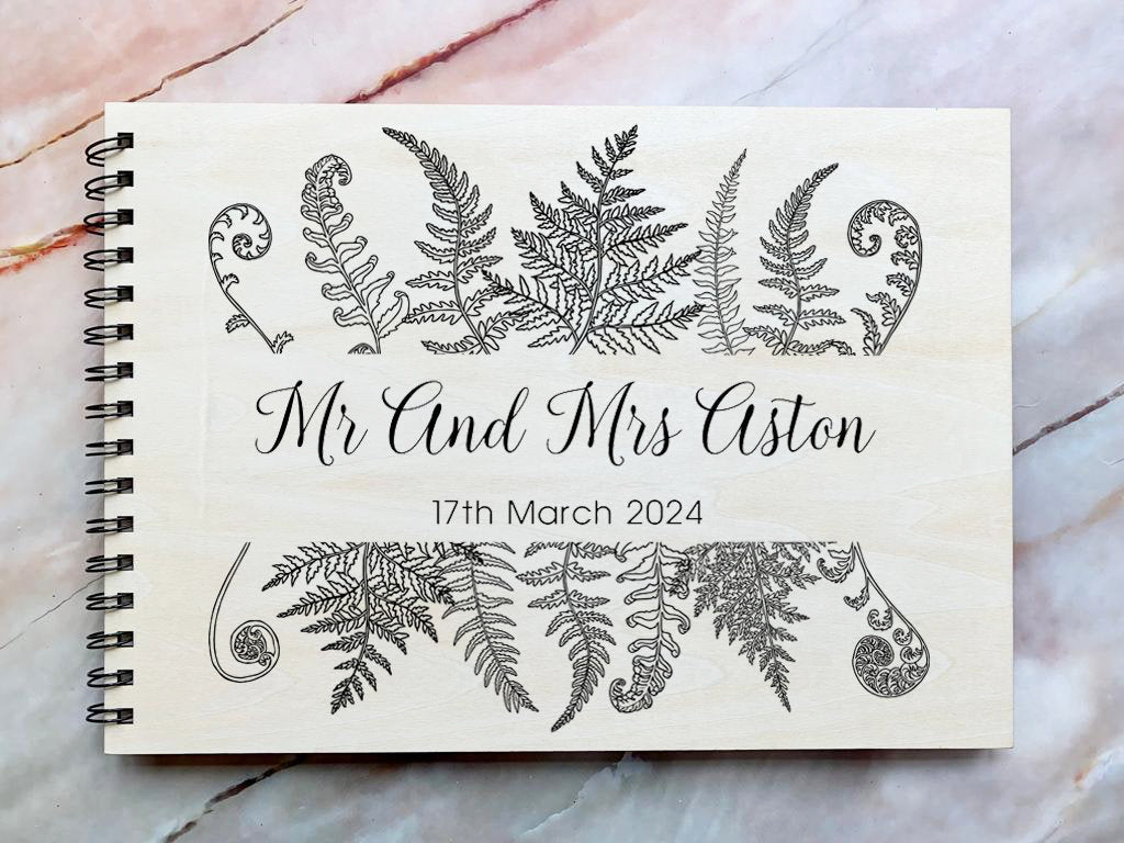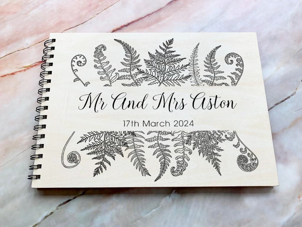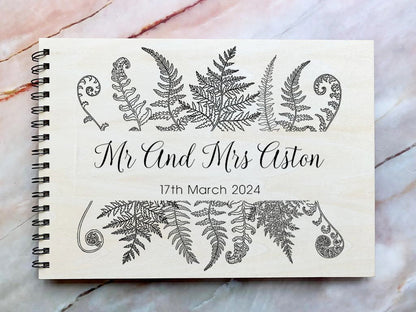 Libro de visitas de boda de madera grabado personalizado con helechos, libro de fotos de boda, álbum de fotos de boda, regalo de boda,