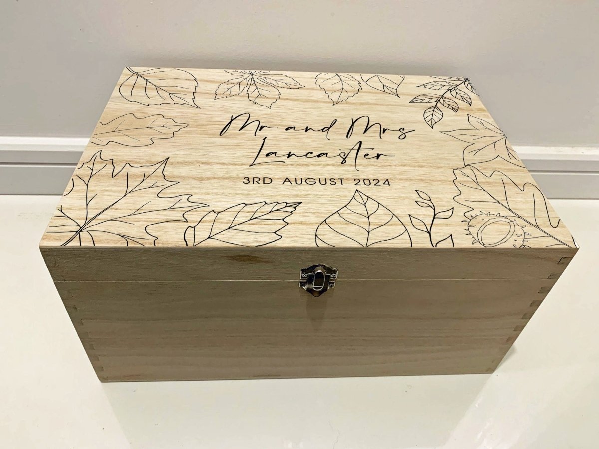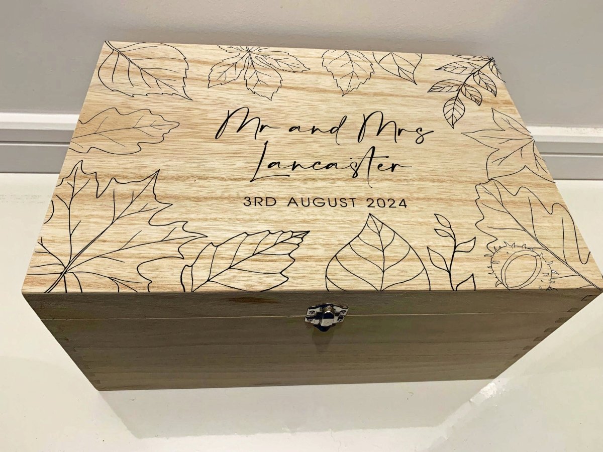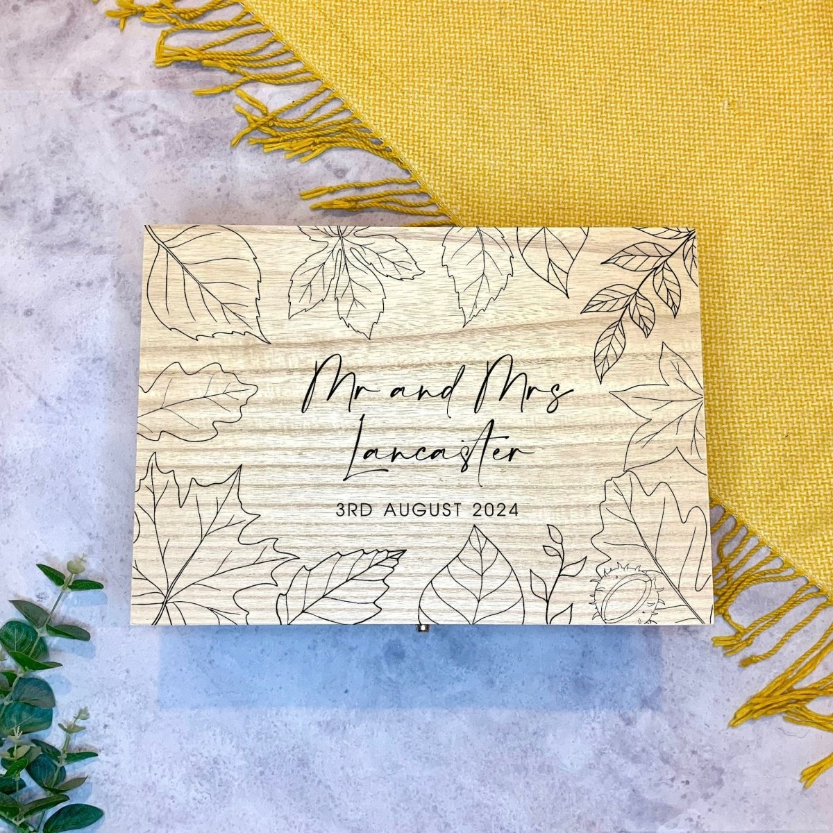 Caja de memoria de recuerdo de boda de madera grabada personalizada grande con hojas de otoño, hojas de otoño