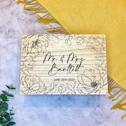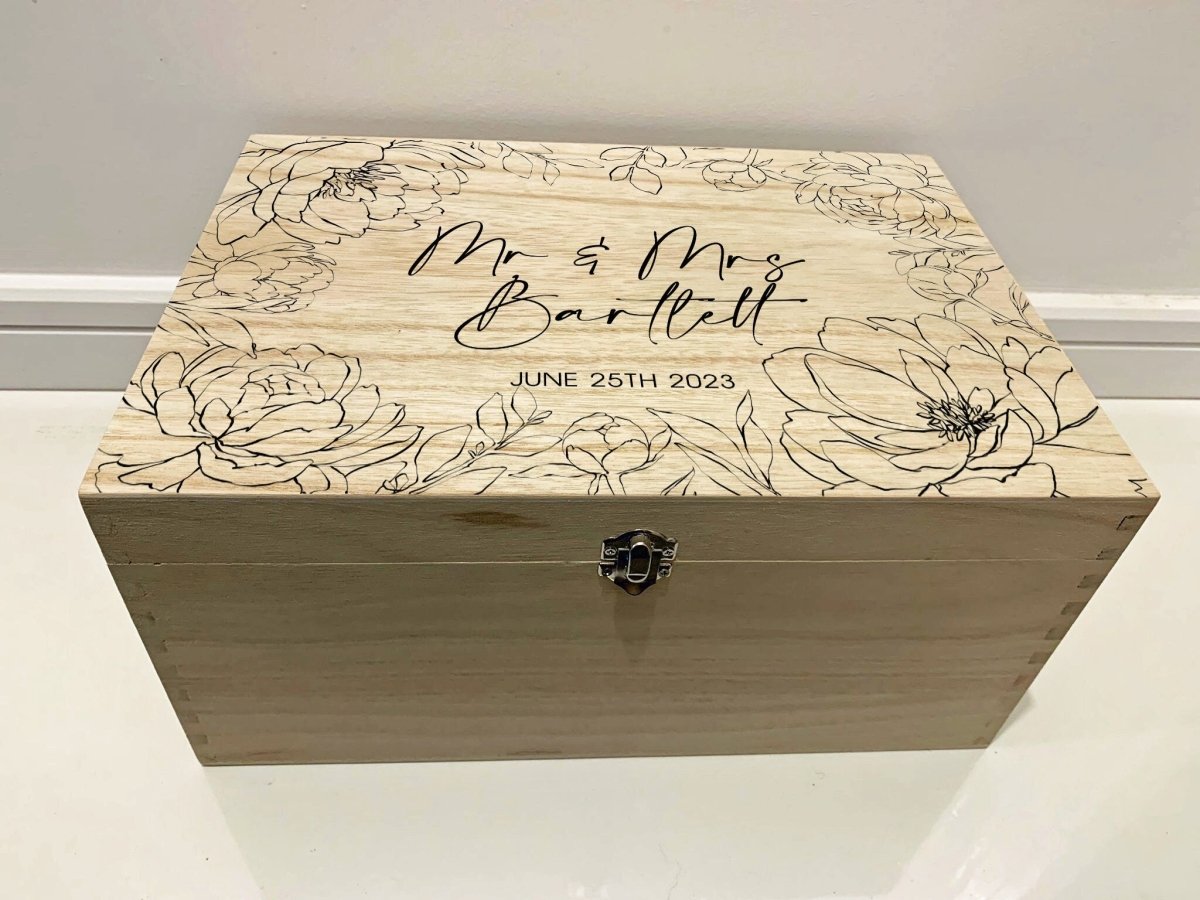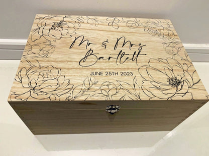 Caja de recuerdos de boda floral de madera grabada personalizada grande con peonías