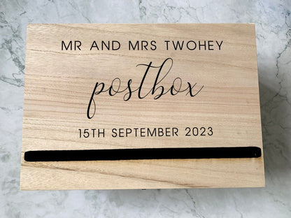Buzón grande personalizado para tarjetas de boda de madera grabada