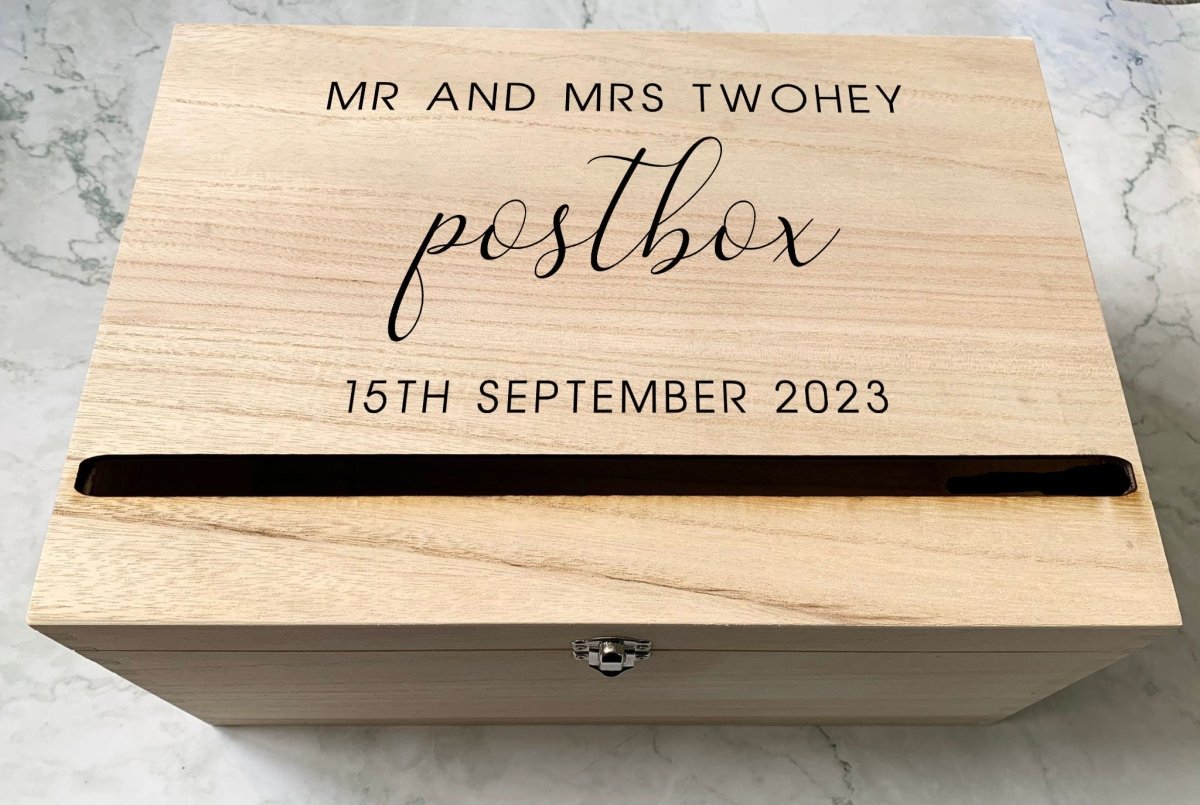 Buzón grande para tarjetas de boda de madera grabado personalizado. Este buzón para tarjetas de boda grabado con láser profesionalmente es la forma perfecta de reunir tarjetas de boda. Múltiples diseños y fuentes para elegir, o si está interesado en un diseño personalizado, póngase en contacto. No hay límite de caracteres para lo que podemos grabar en estos cuadros, así que no dudes en proporcionar cualquier nombre y detalle para usar. ¡Asegúrese de verificar que la ortografía sea correcta ya que copiamos exactamente lo que escribe!