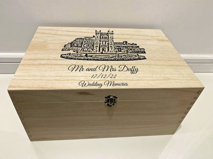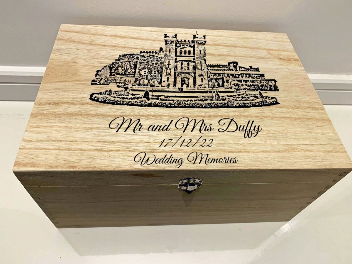 Esta gran caja de recuerdos de boda de madera grabada personalizada es el artículo perfecto para conmemorar su día especial. Esta caja está realizada con madera maciza y personalizada con el lugar de la boda de los novios y un mensaje de amor. El acabado grabado garantiza que este regalo de bodas durará muchos años.