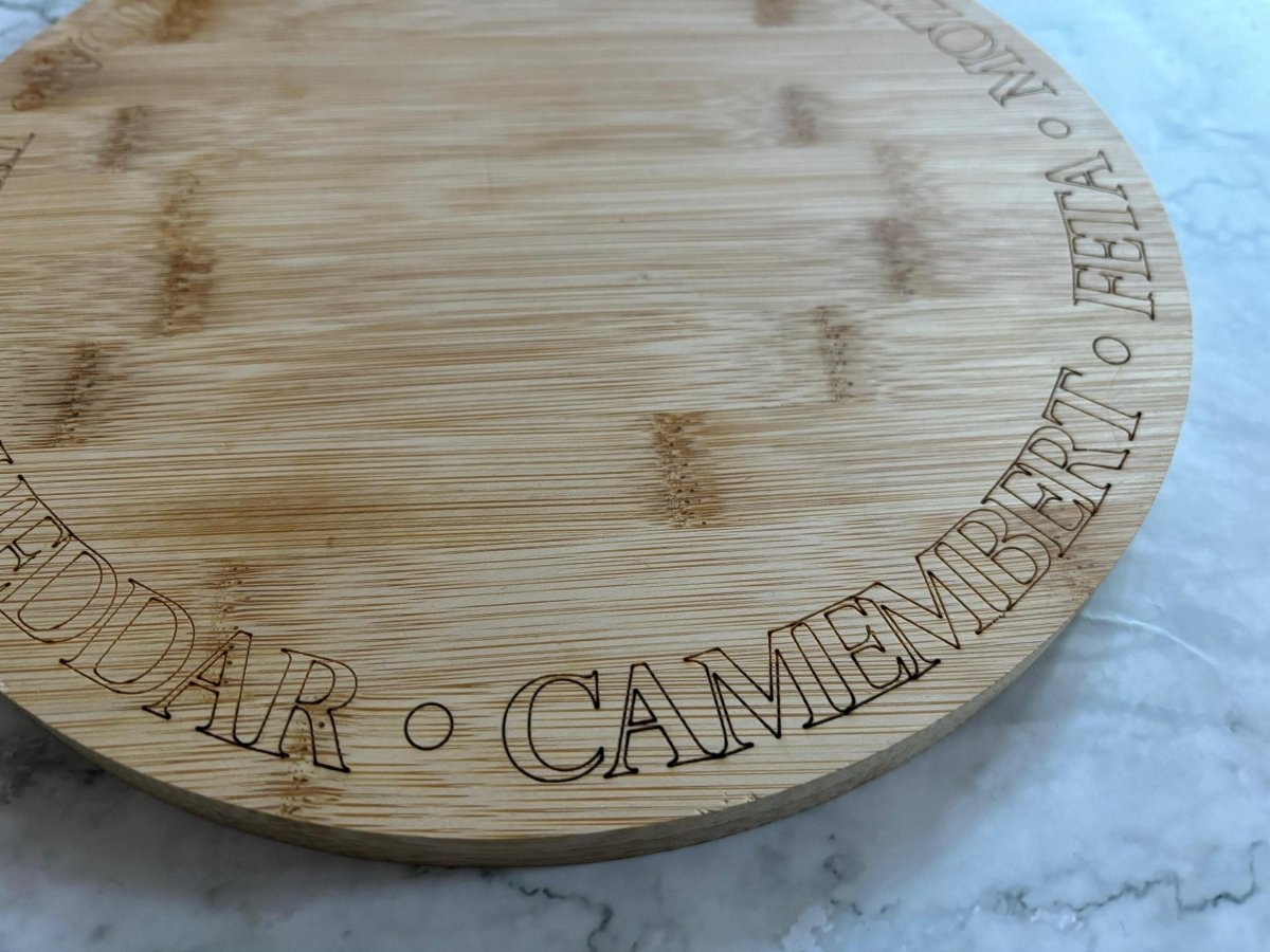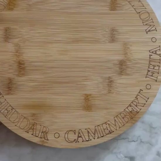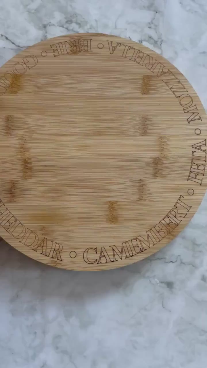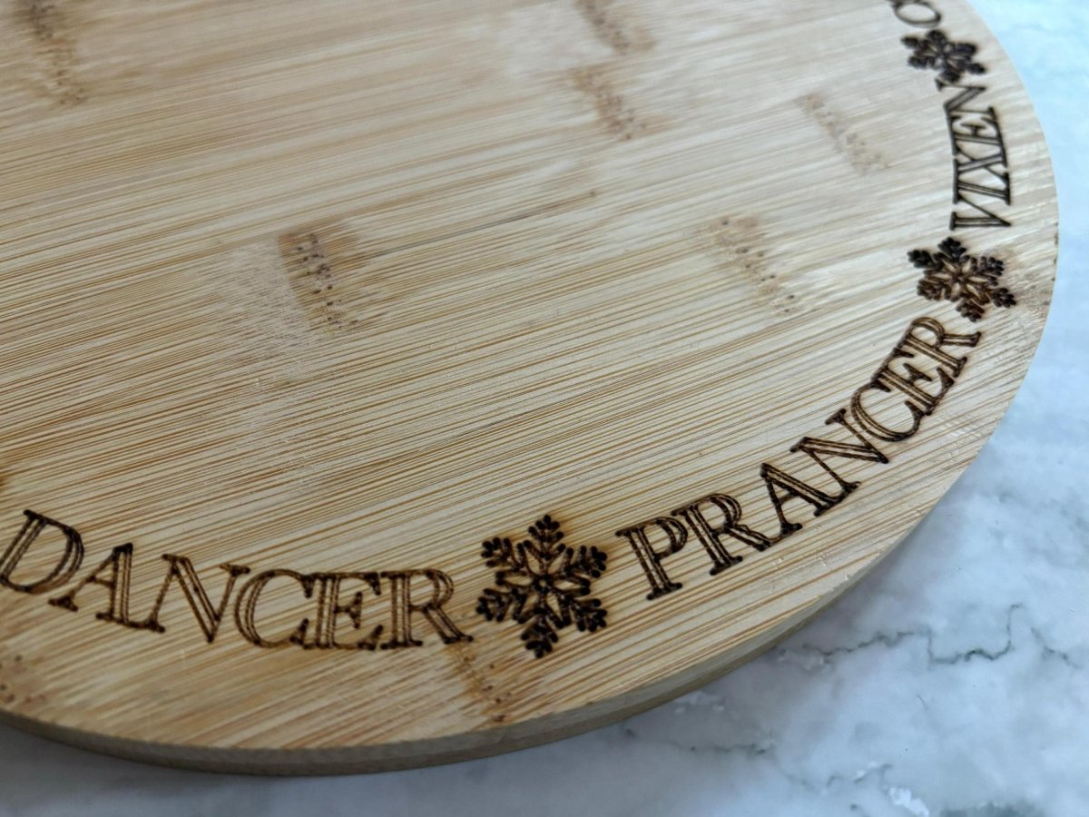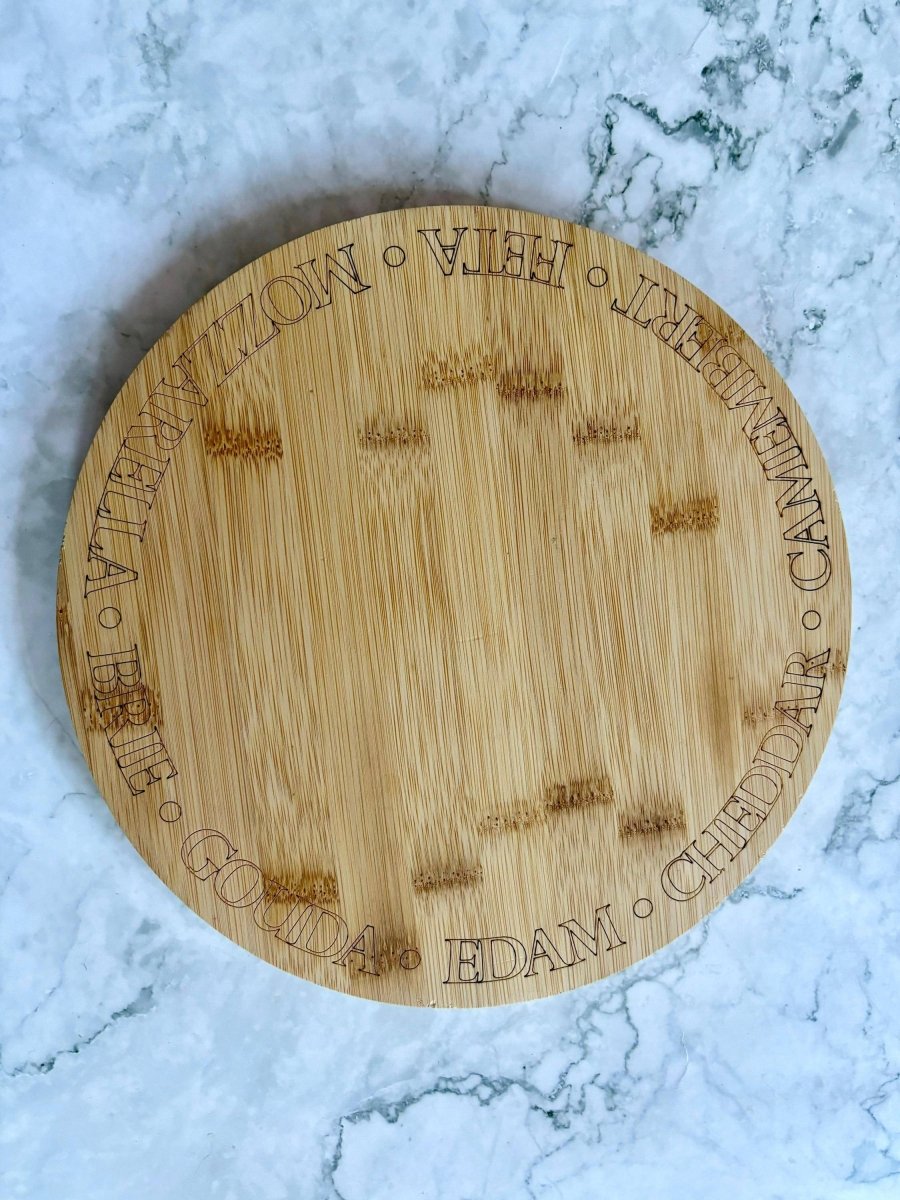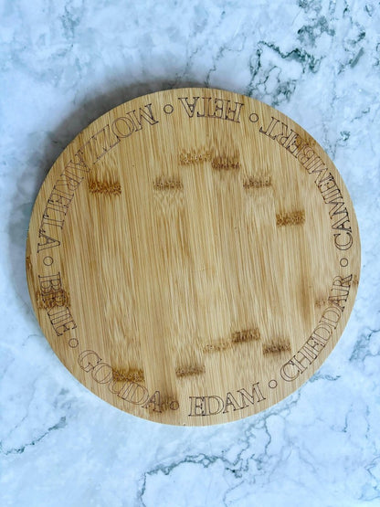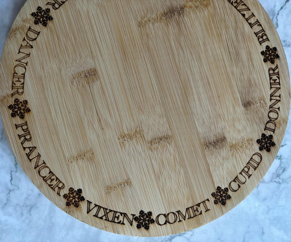 25cm Round and double sided. Includes a side with cheese names and a side with reindeer names perfect for Christmas.
