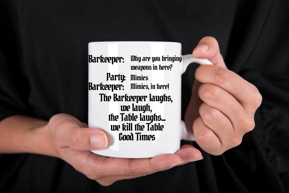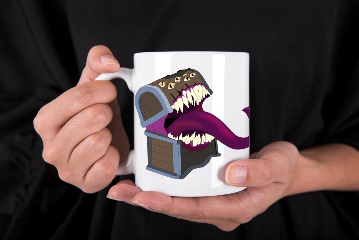 Experience a touch of humor with the Mimic Joke DnD Mug. Made from durable ceramic, this mug features a clever treasure chest design and a playful joke. Perfect for any gaming fan, this mug is sure to bring a smile to your face.