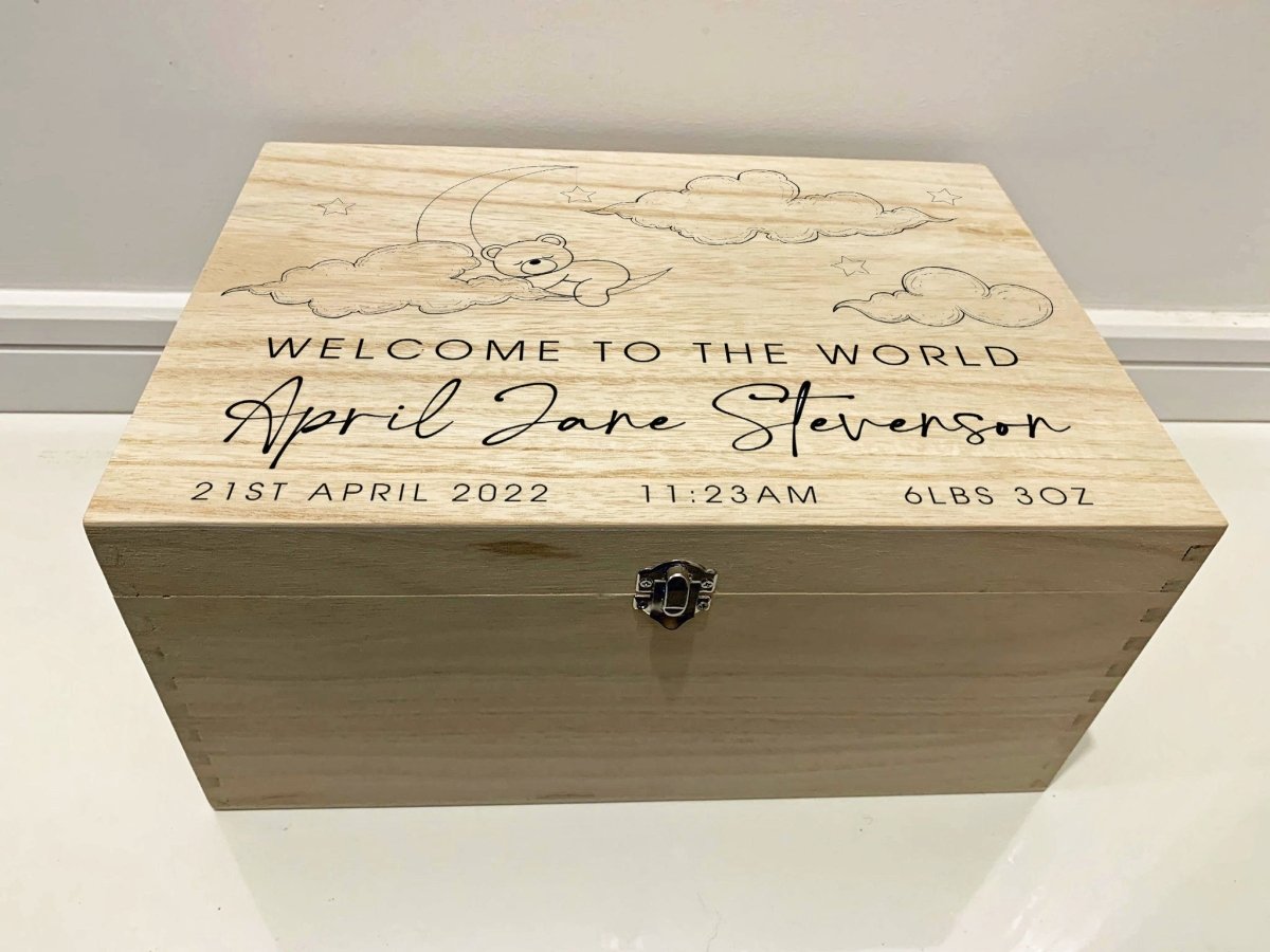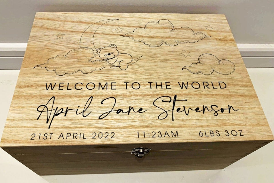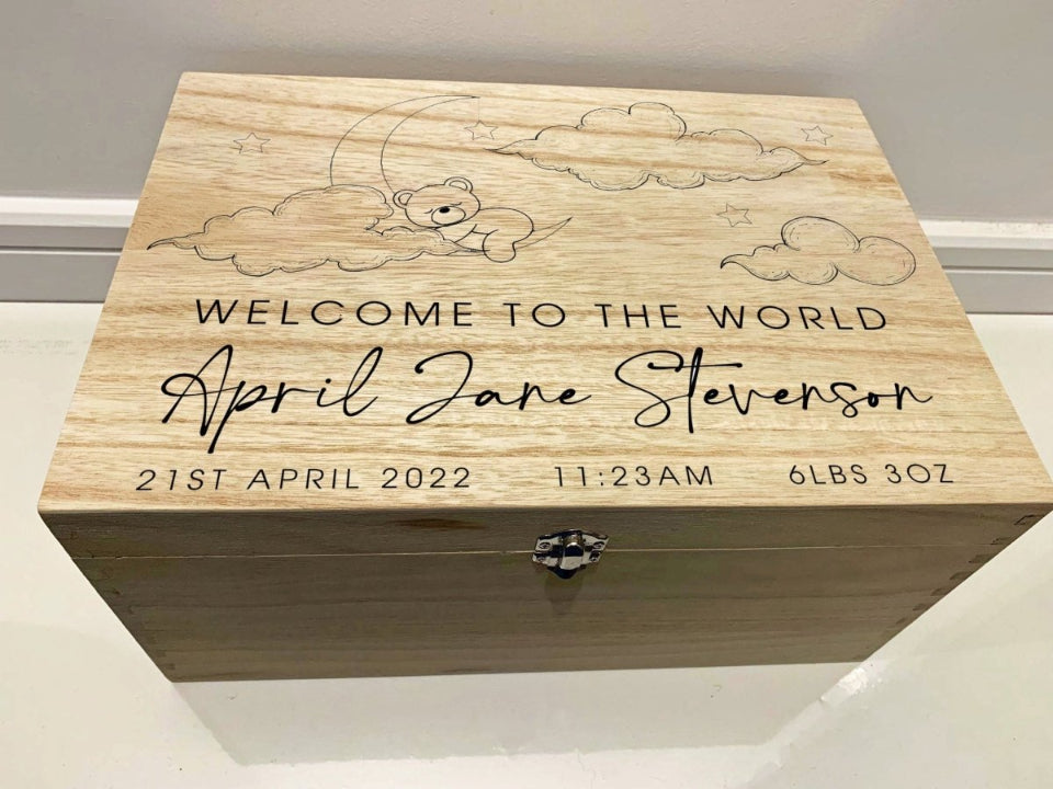 This personalised baby keepsake box features an engraved baby bear sleeping among the clouds. Keep your baby's memories safe and organized in this charming and unique box. A perfect gift for new parents and a precious keepsake for years to come.