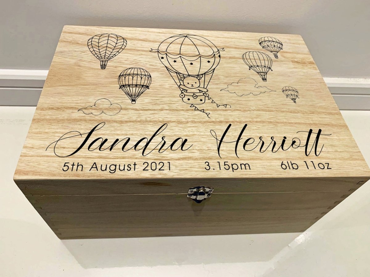 Expertly showcase cherished memories with our personalised baby keepsake box featuring hot air balloon designs. Crafted from high-quality wood, each box can be engraved with a name, date, or special message. Preserve your little one's precious moments in style with this unique and timeless gift.