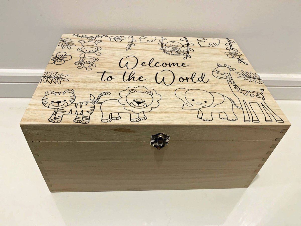 Personalised Baby Keepsake Box with Jungle Animals. Large Personalised Engraved Wooden Baby Initial Keepsake Memory Box with Jungle Animals, Lion, Tiger, Giraffe, Elephant, Monkey, Snake