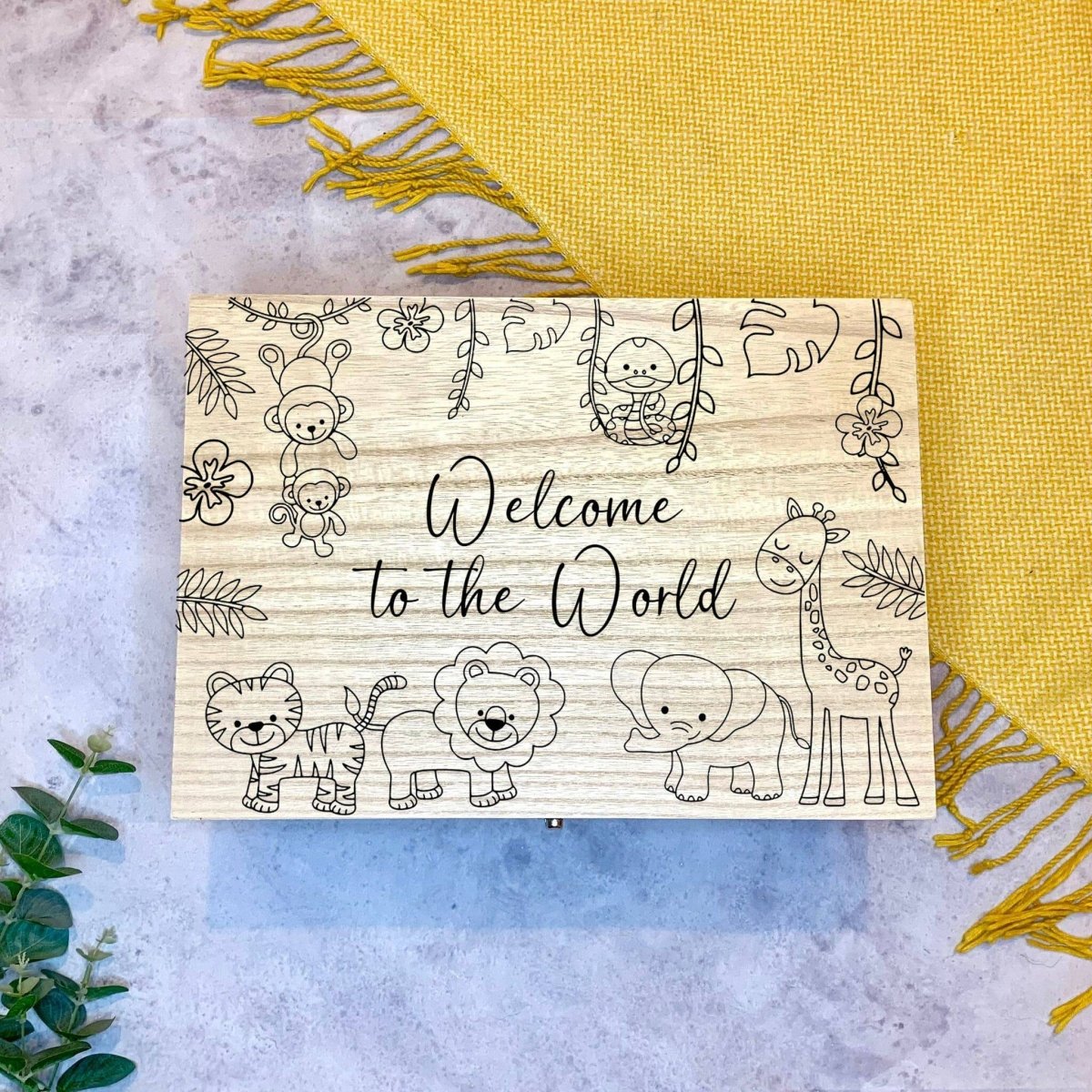 This customisable baby box is a great way to commemorate a special event with a wonderful personalised gift! The box is engraved with a variety of vibrant illustrations, including a jungle filled with various animals – such as a lion, tiger, giraffe, elephant, monkey and snake – to create beautiful memories that will last a lifetime.