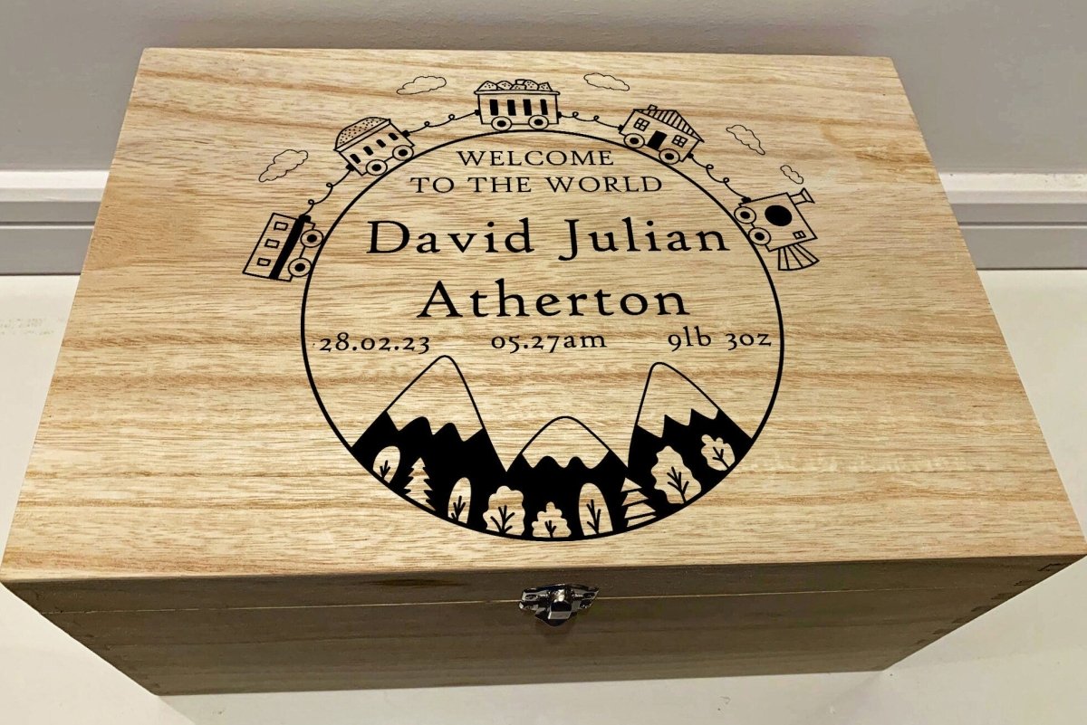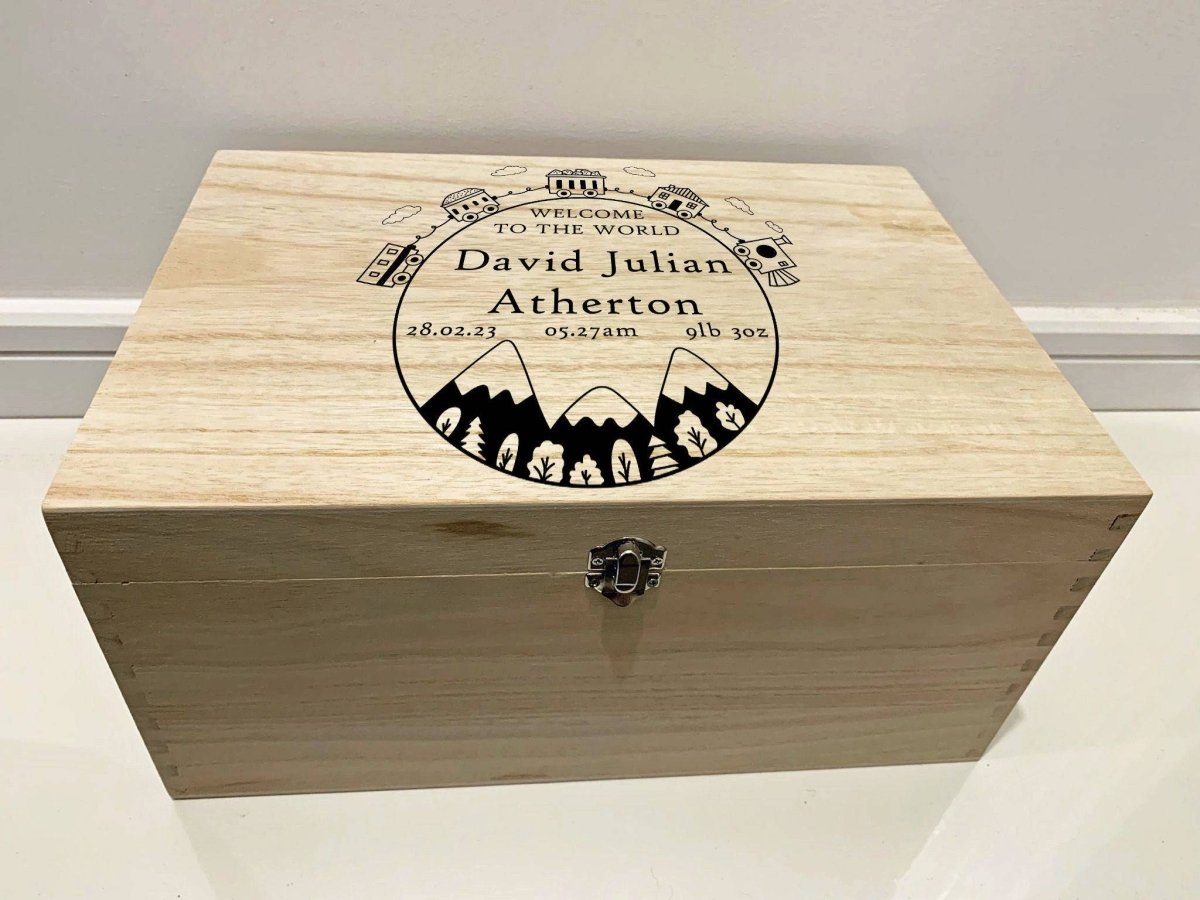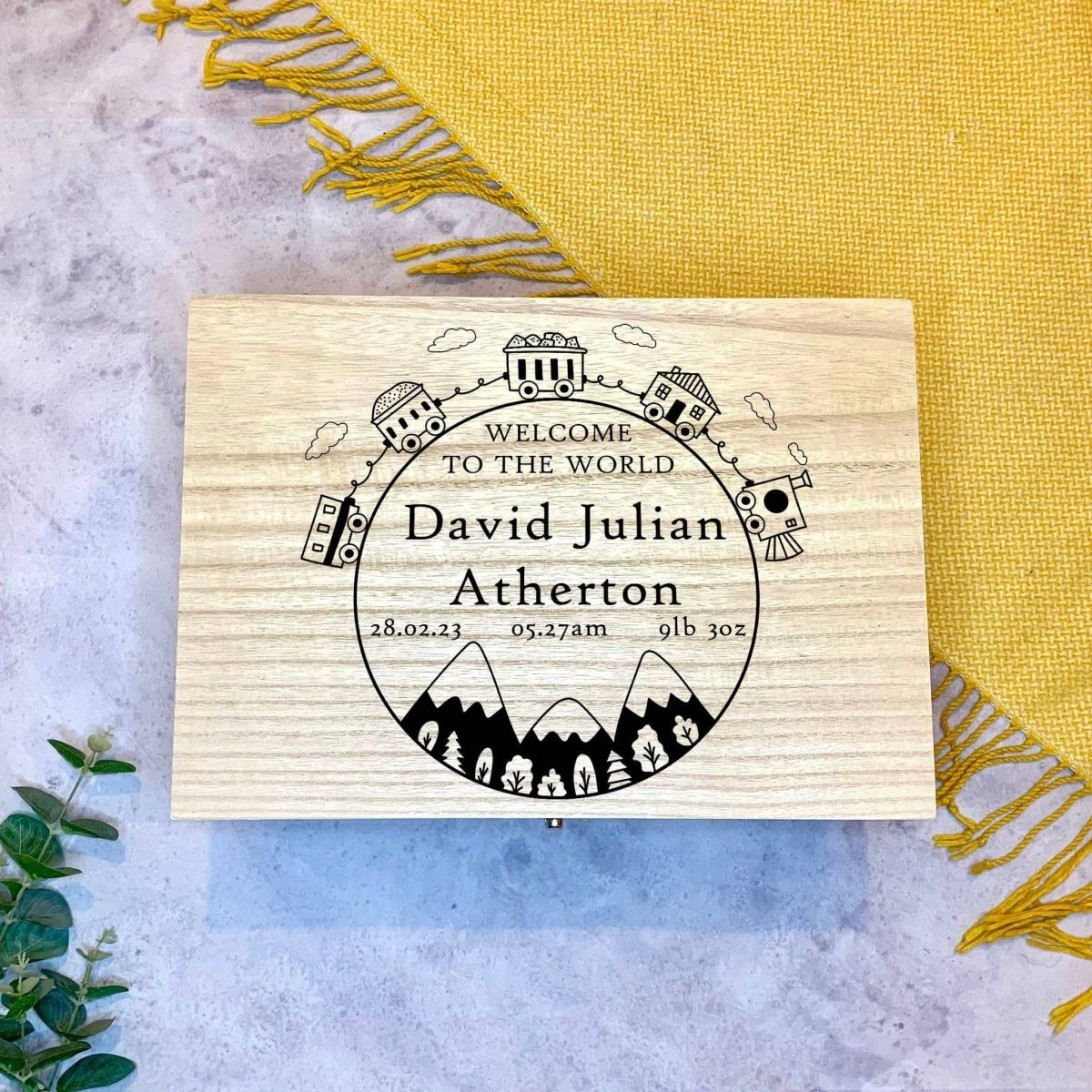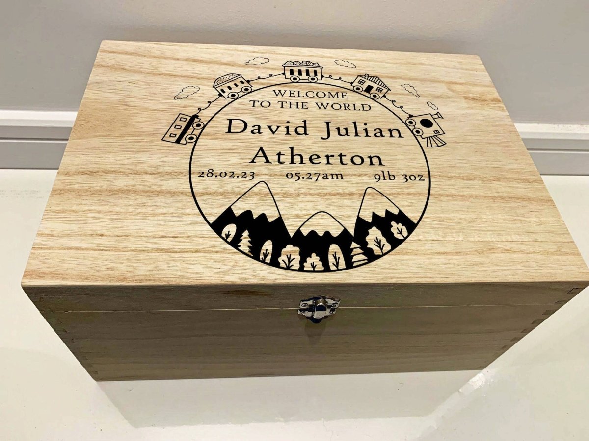 This personalised baby memory box is intricately engraved with a beautiful mountain train set, capturing your little one's most precious memories forever. The fine craftsmanship of this bespoke design ensures a lifetime of quality.