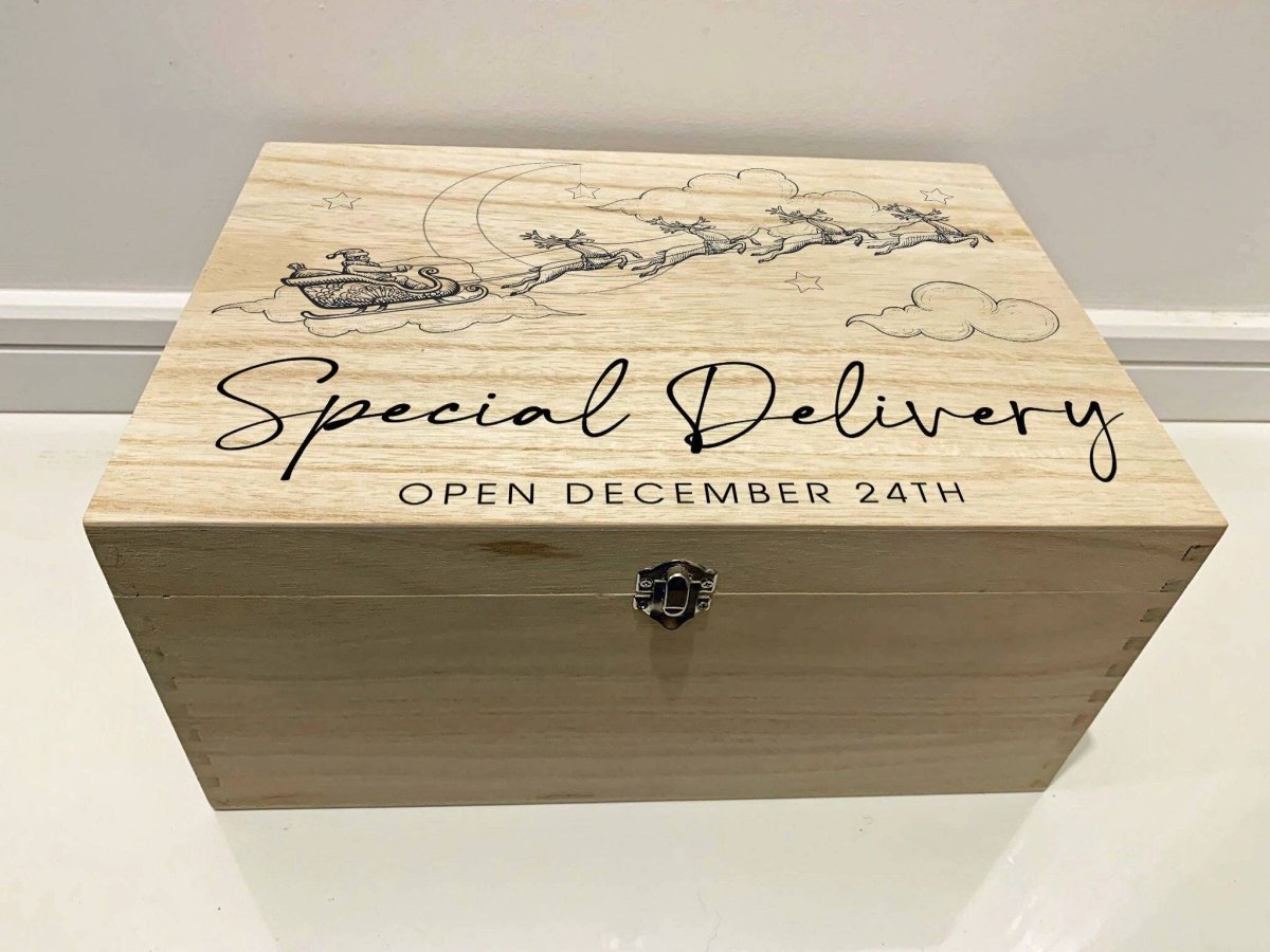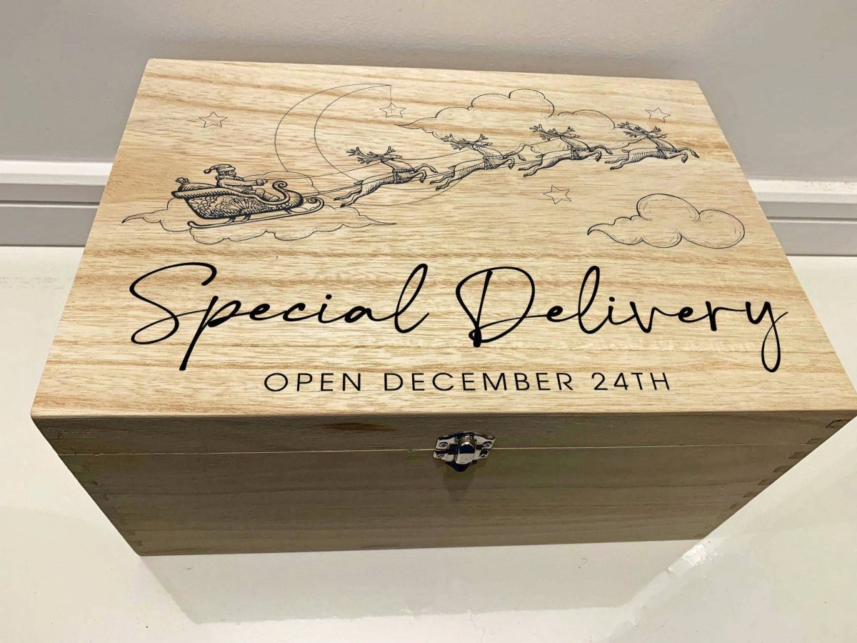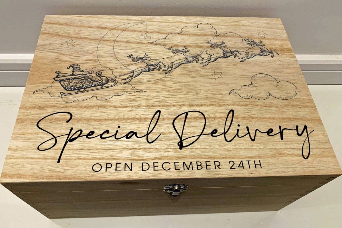 Make this Christmas Eve extra special with our personalised wooden box, engraved with a special delivery from Santa and his reindeer. Open it on December 24th for a magical surprise!