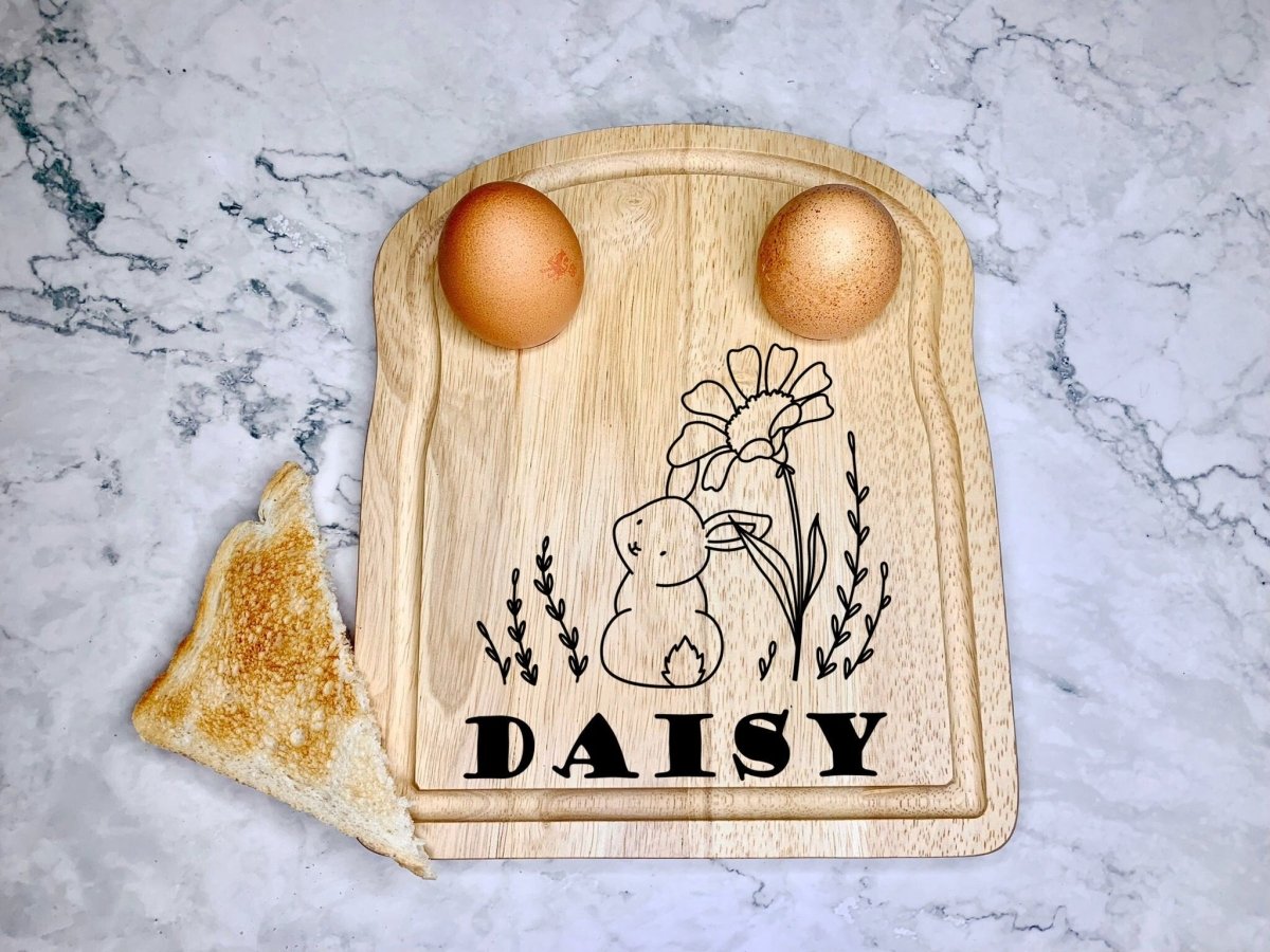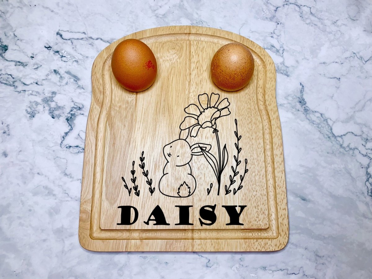 This personalised dippy egg board features an adorable Easter bunny and flower design, expertly engraved onto sustainable bamboo. Perfect for adding a touch of charm to your breakfast routine, while also being eco-friendly. Make any breakfast special with this unique and practical serving board.