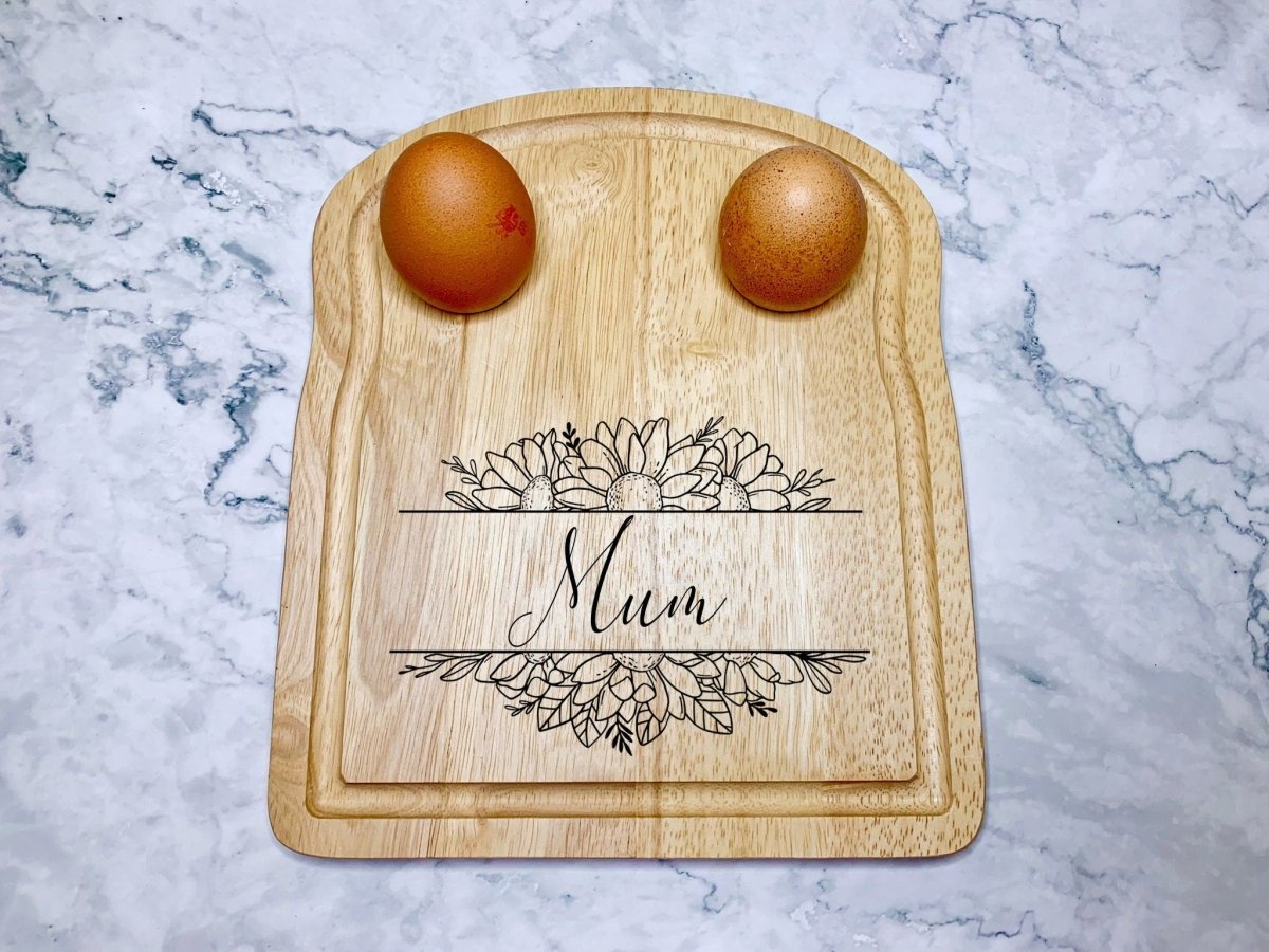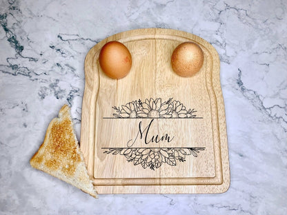 Personalised Floral Engraved Wooden Egg and Toast Breakfast Board with Sunflowers