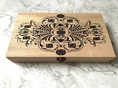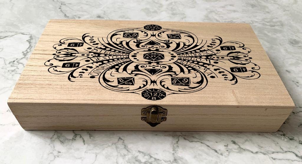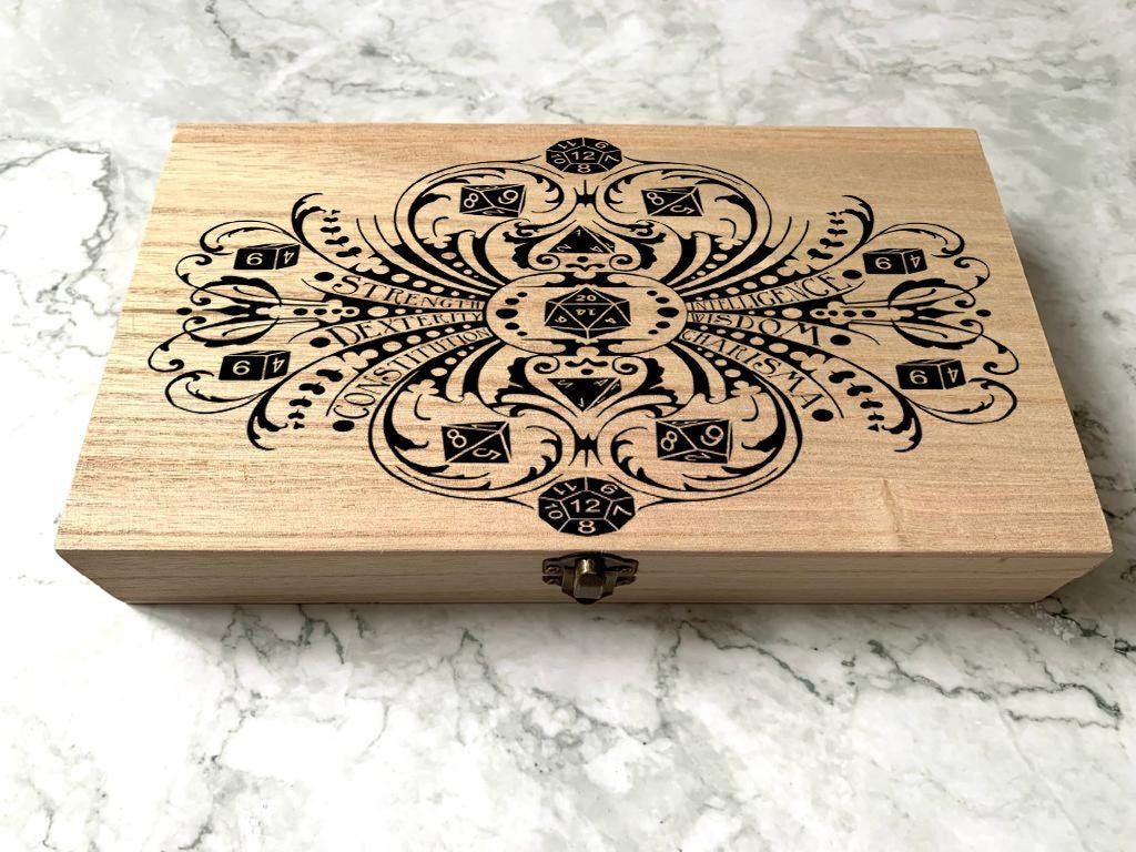 Elevate your gaming with our Personalised DnD Dice Box. Made of high-quality wood, this box features character stats incorporated into a decorative design. Keep your dice safe and organized in style. Enhance your gaming experience today!