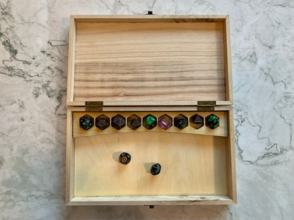 This professionally laser etched dice box is the perfect way to store all your dungeons and dragons dice.