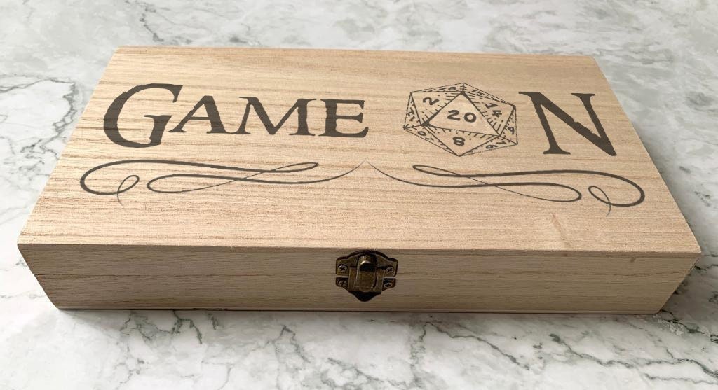 Don't just keep your DnD dice in a boring box, personalise it with our DnD Dice Box - Game On! Made of high-quality wooden material, this engraved box is perfect for storing your critical hit dice. Level up your game with style and customization.