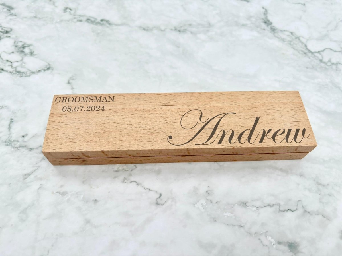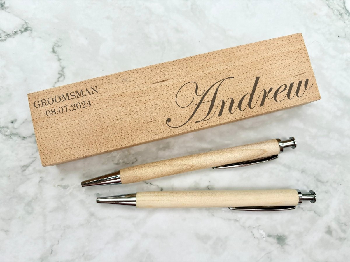 This personalised engraved wooden pen set is the perfect gift for groomsmen, fathers of the bride and groom, and the entire bridal party. The elegant design and timeless appeal of this set make it a practical and thoughtful gift for any occasion.