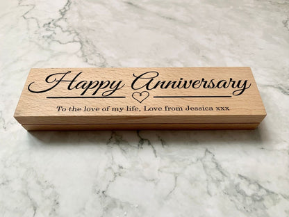 Celebrate your 5th wedding anniversary in style with this personalised Happy Anniversary pen and pencil gift set. Made from high-quality wood and engraved with a heart detail, this set is the perfect gift for your loved one. Make it truly special by adding a personal touch to this elegant and thoughtful present.